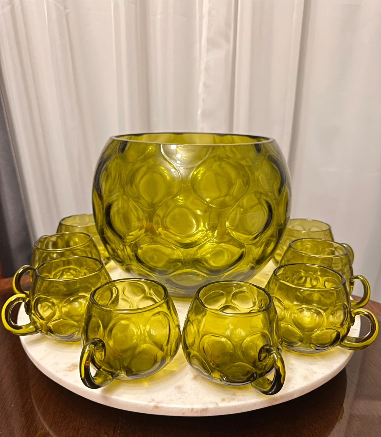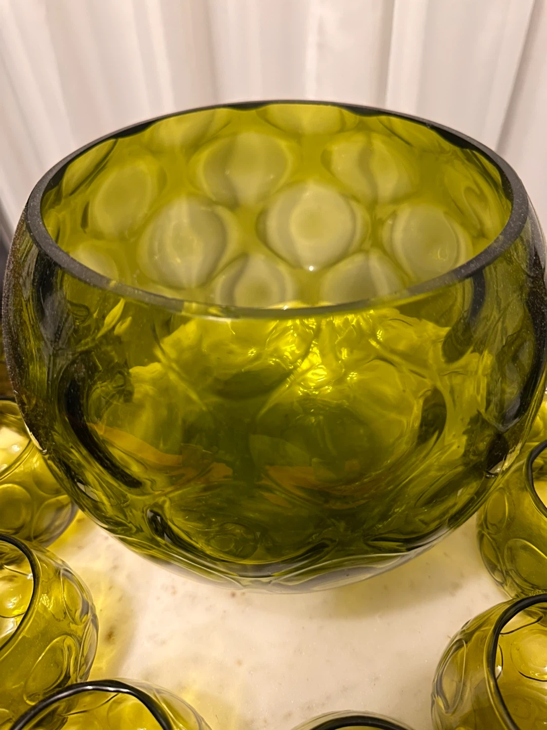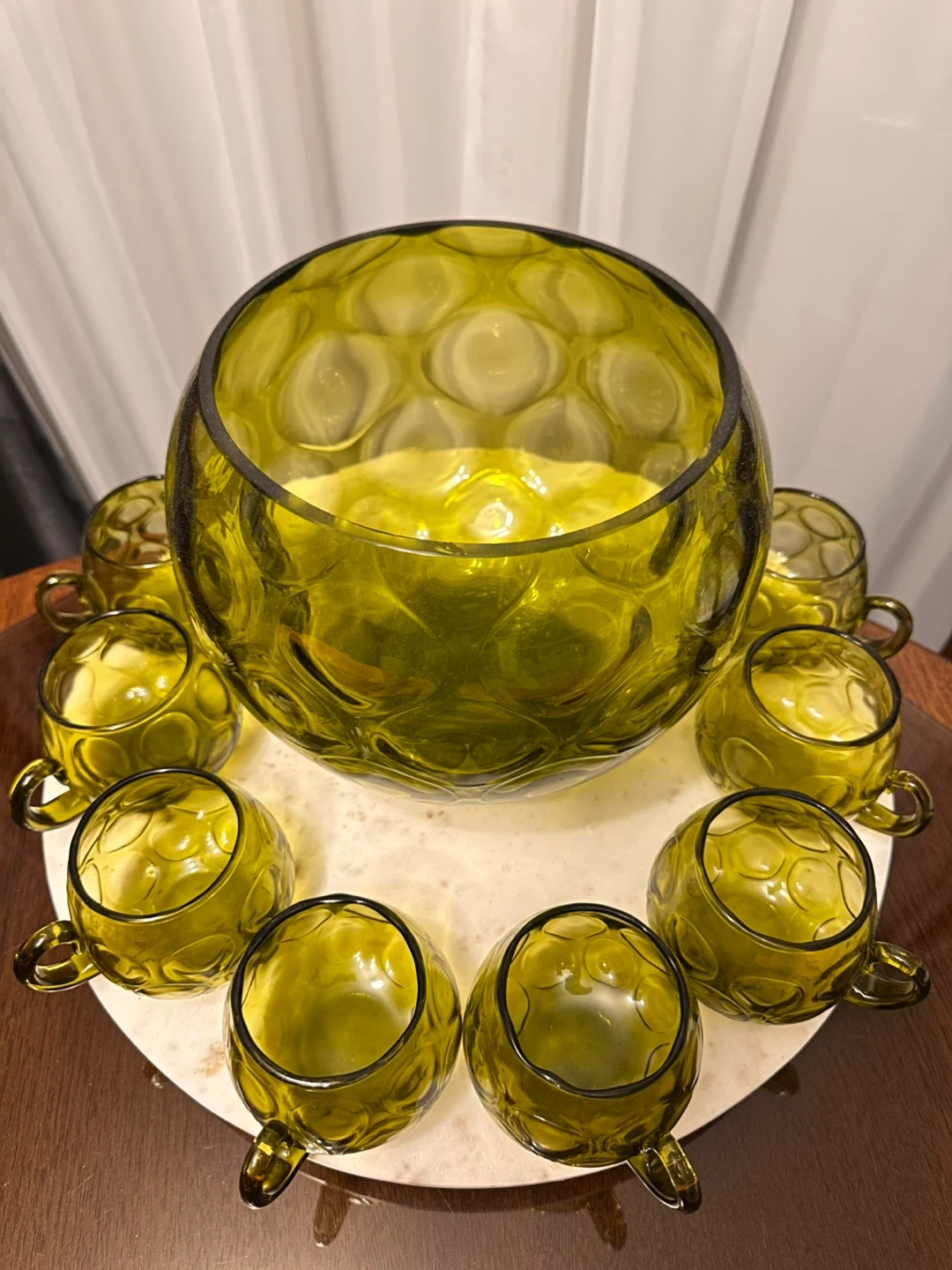 Selling a vintage olive green glass punch bowl set! It features a large punch bowl and eight matching cups. The set has a unique textured design. Perfect for parties or as a decorative piece! Give me your best offer! :)