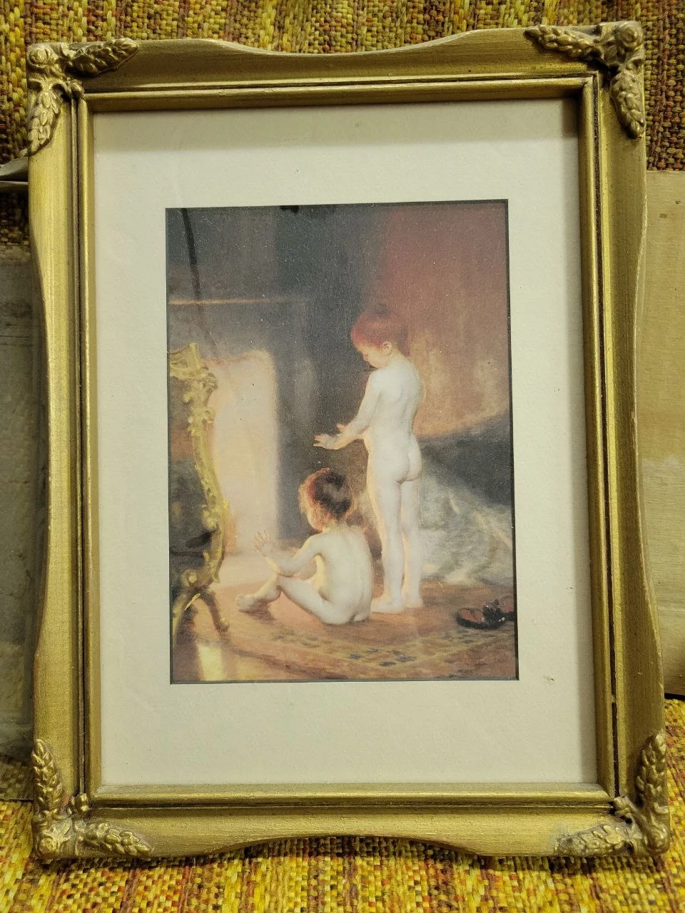 17Vintage painting of two children, artist unknown. Comes in vintage frame and wall backing to hang on wall. In great condition.