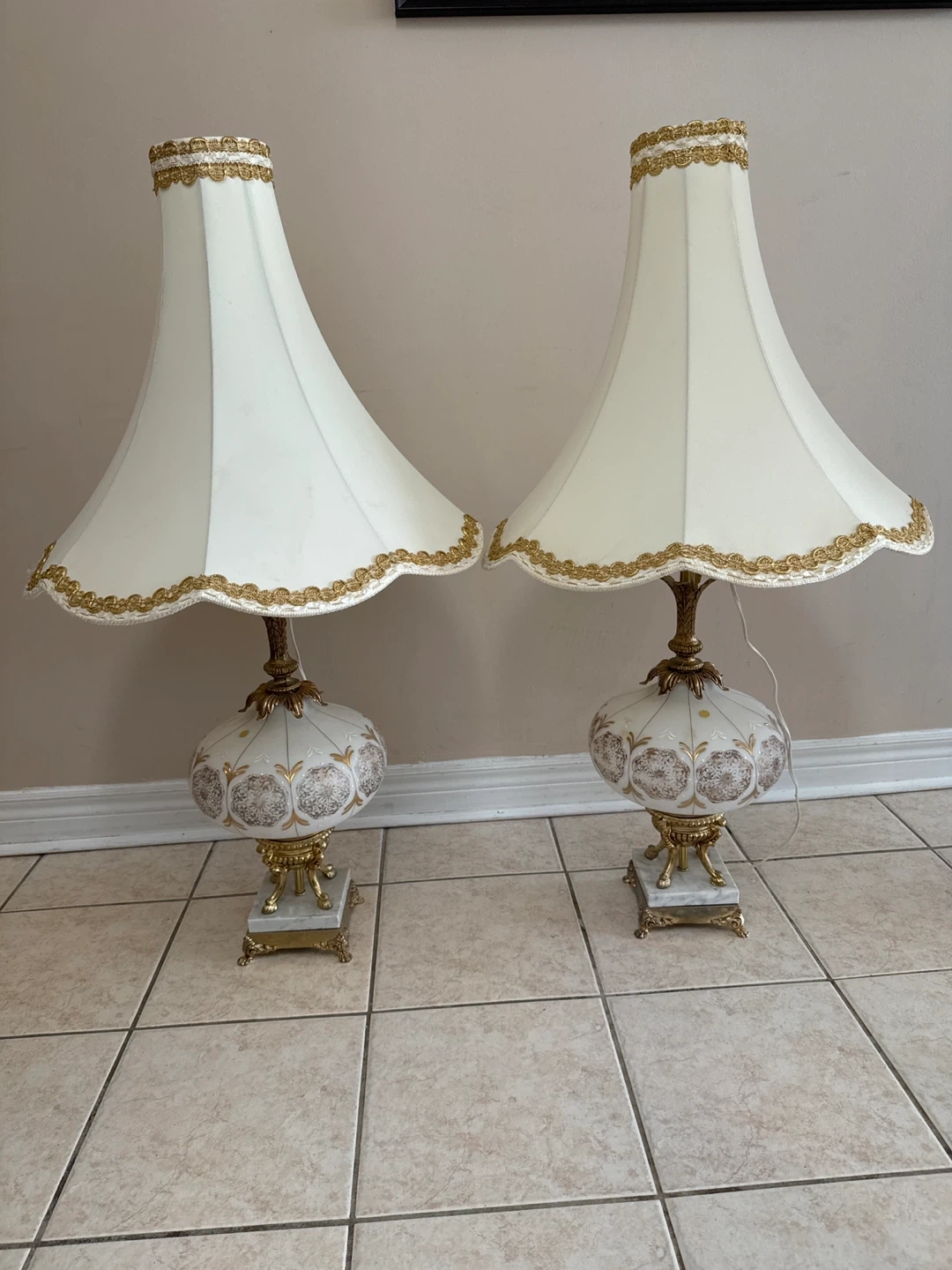 17Selling a beautiful pair of vintage lamps. They come with their original shades. The lamps feature a lovely white and gold design, adding a touch of elegance to any room. They're in good condition and ready to brighten up your space!Vintage Pair of GERMANY Hand Painted Blown Art Glass Brass Table Lamps on Marble Bases