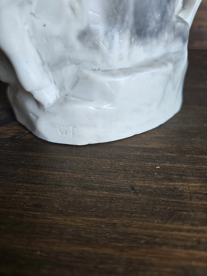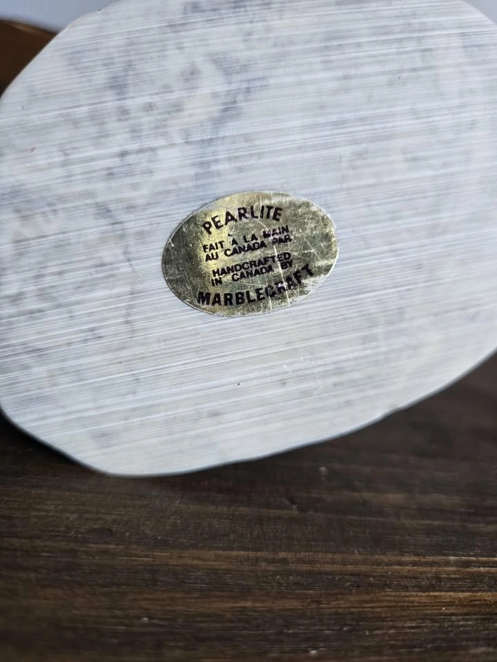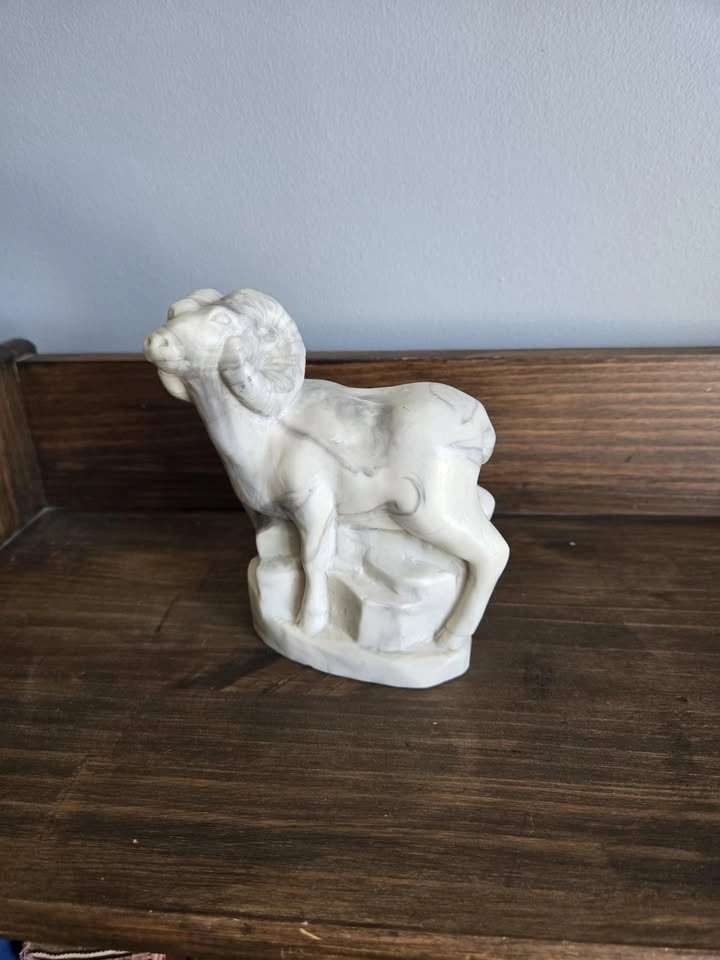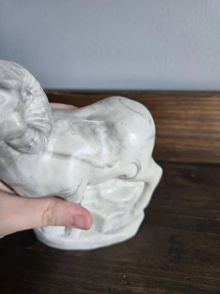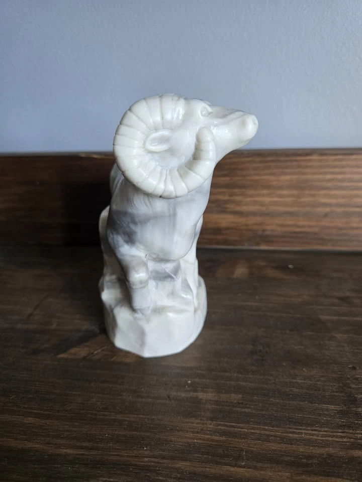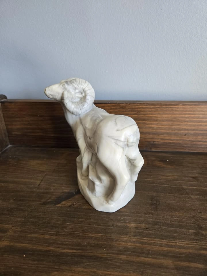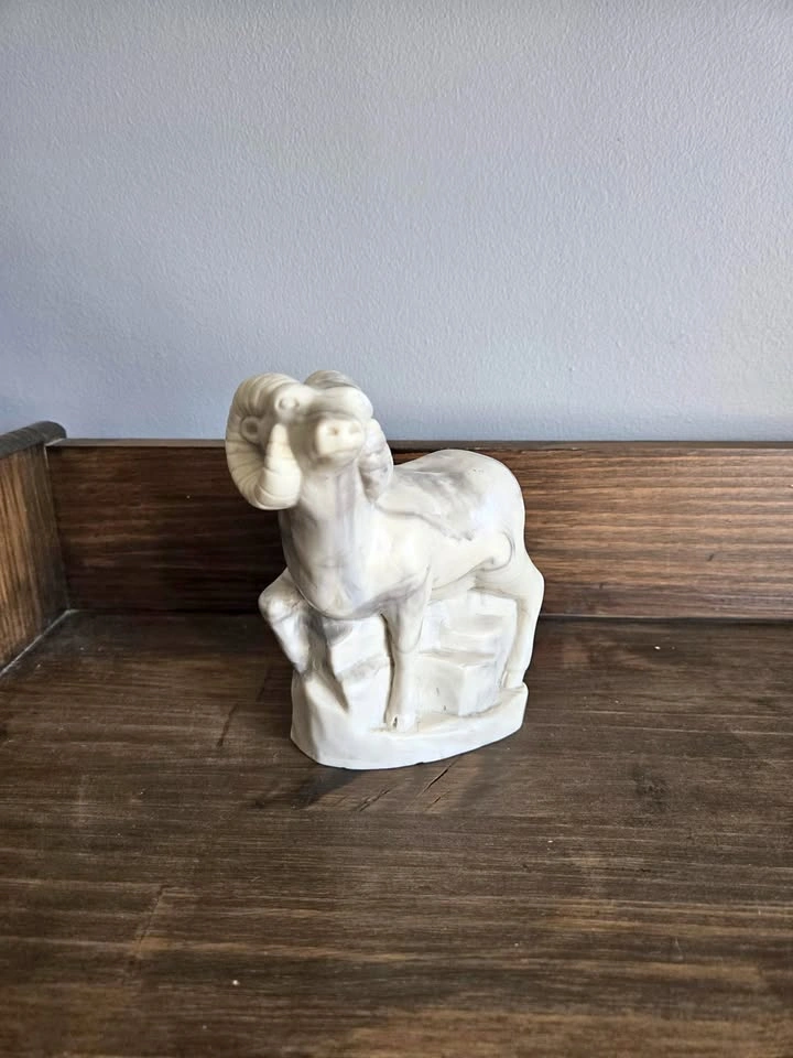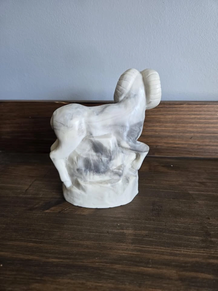 0Vintage bighorn sheep sculpture, made of marble composite material with swirled white and gray coloring. This figurine was mold cast. It has the initials of the artist, GT, as well as a foil sticker from the manufacturer, Pearlite Canada. Very good vintage condition. There are some minor scuffs but they are not very visible due to the surface of the sculpture being textured. app 5 3/8" tall by 4 1/4" long by 3 1/4" wide. Pickup in Beaumont.
