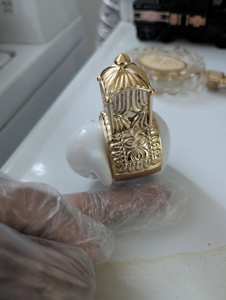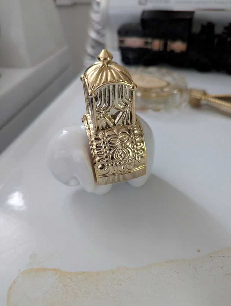109Unique vintage perfume bottle. Gold-tone carriage design atop a white elephant. Collectible item. Ideal for perfume enthusiasts or collectors.SMALL