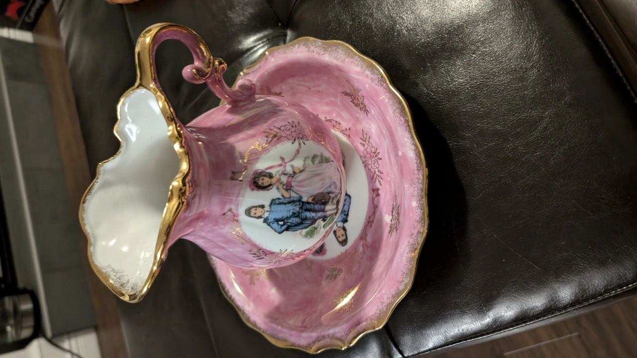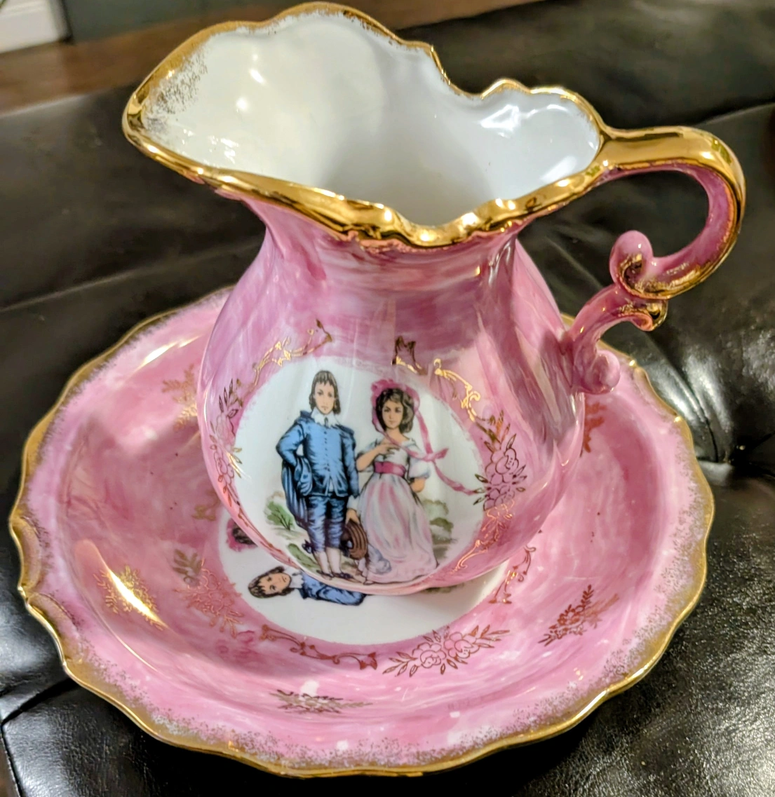 10Selling a lovely vintage pink pitcher and bowl set. The set features a charming design with gold accents. It would make a great addition to any collection or a beautiful decorative piece for your home