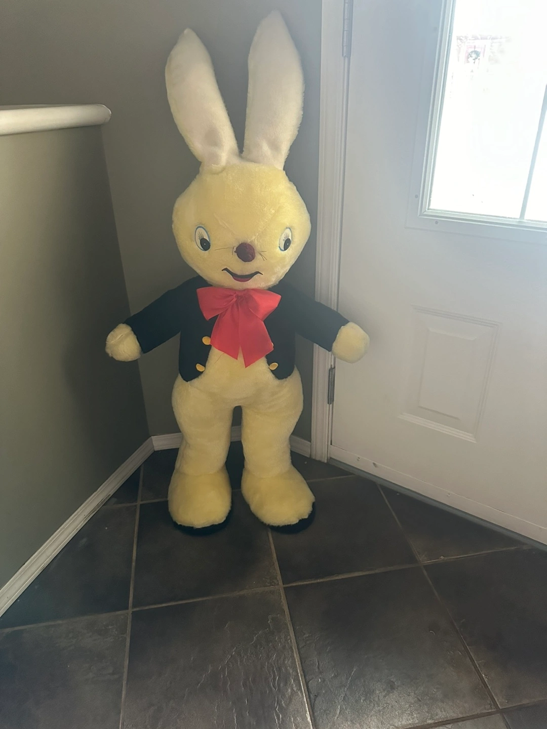 Large plush bunny wearing a black jacket and red bow tie. Measures approximately 3 feet tall.