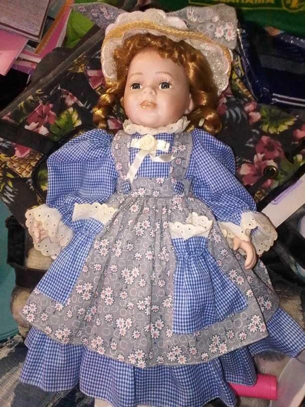 24Here's a lovely vintage porcelain doll! She's wearing a charming blue and grey dress with a floral pattern and a matching hat. She would make a great addition to any doll collection!