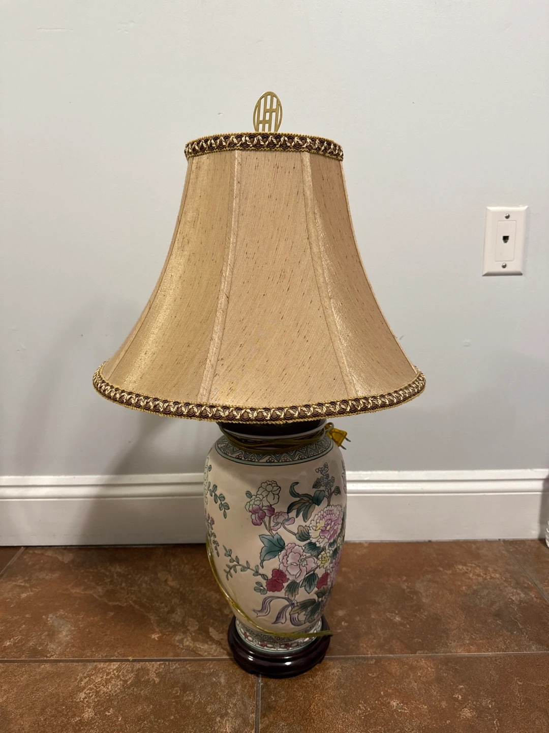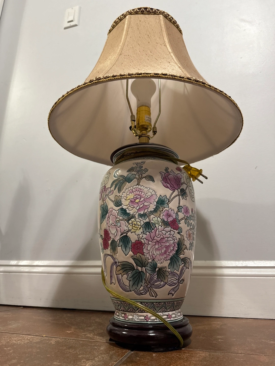 Beautiful vintage table lamp. Features a porcelain base with a floral design and a beige fabric shade. Cord and plug included. Great addition to any home décor.