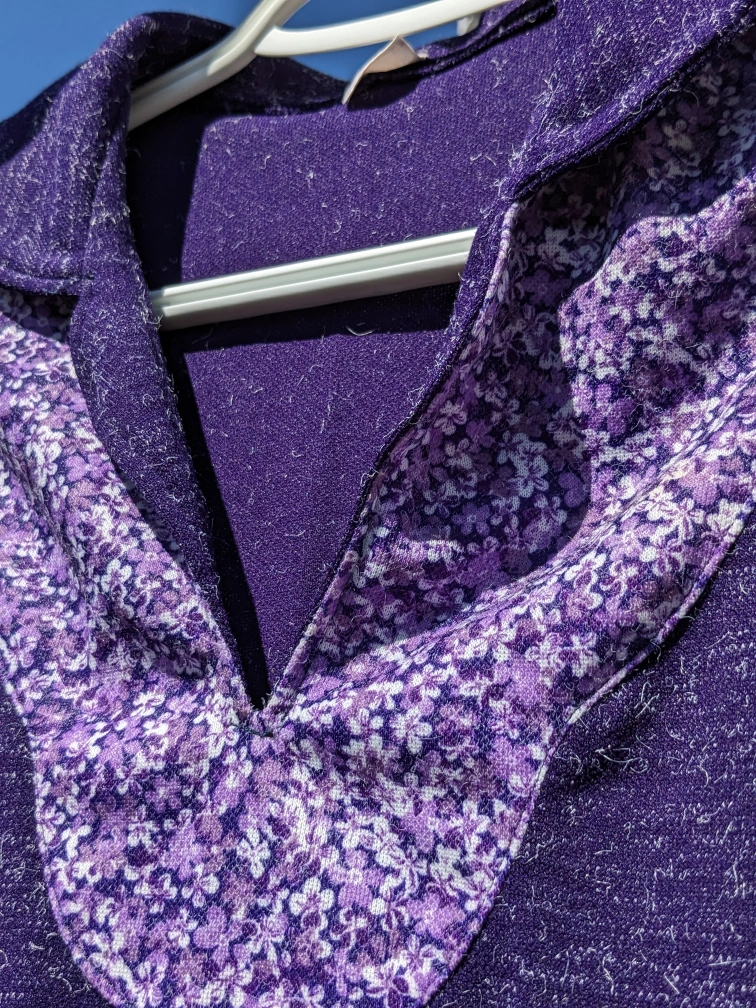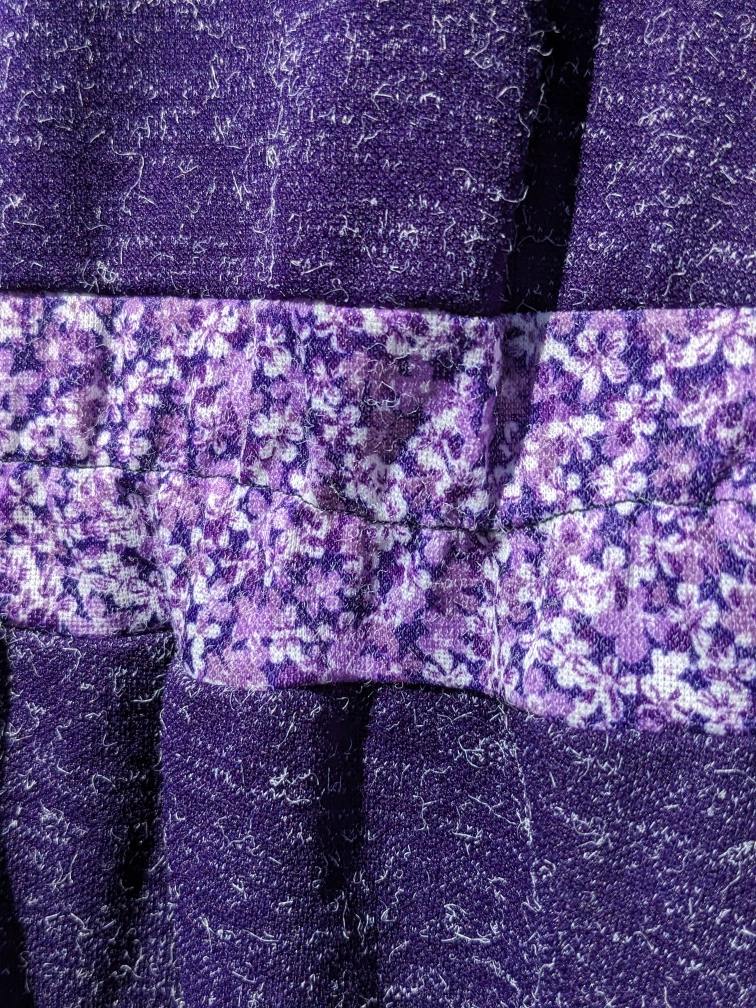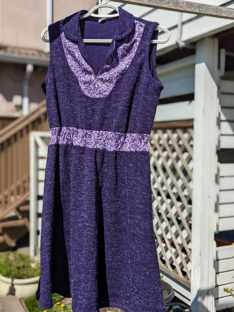 Here's a lovely purple dress! It's made of 100% polyester and features a cute floral pattern around the collar and waist. It's in great condition and would look fantastic for any occasion