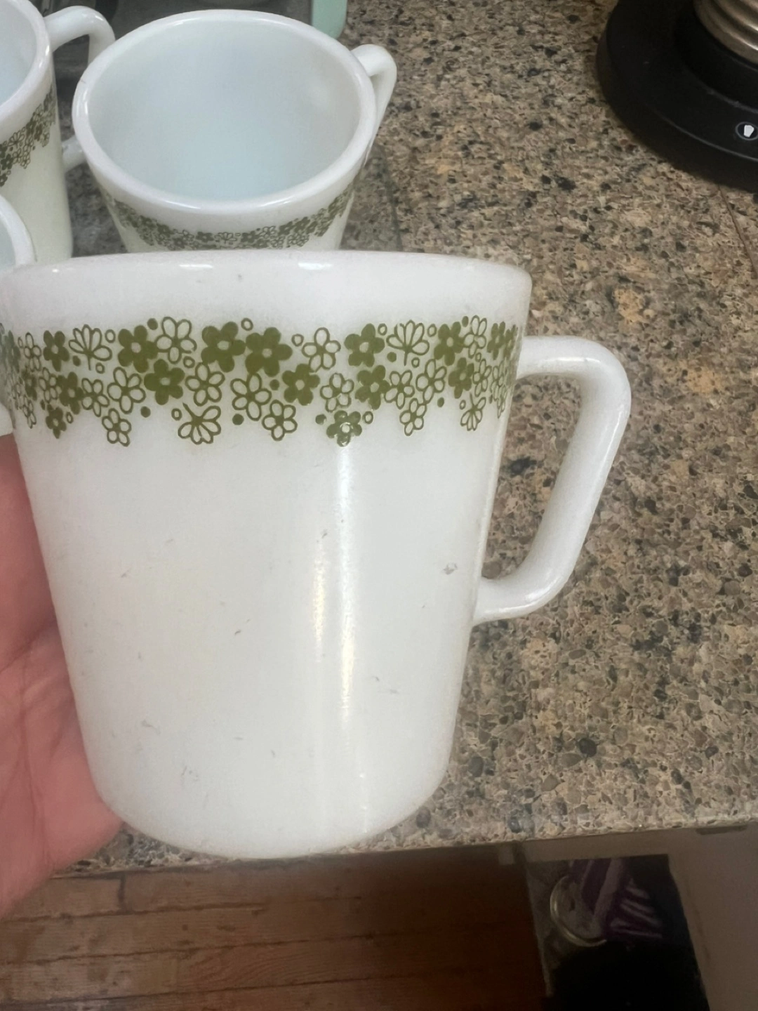 75Rare mid century modern set of six vintage Pyrex mugs. Green floral pattern. Microwave and oven safe. Pre-owned, minor wear.