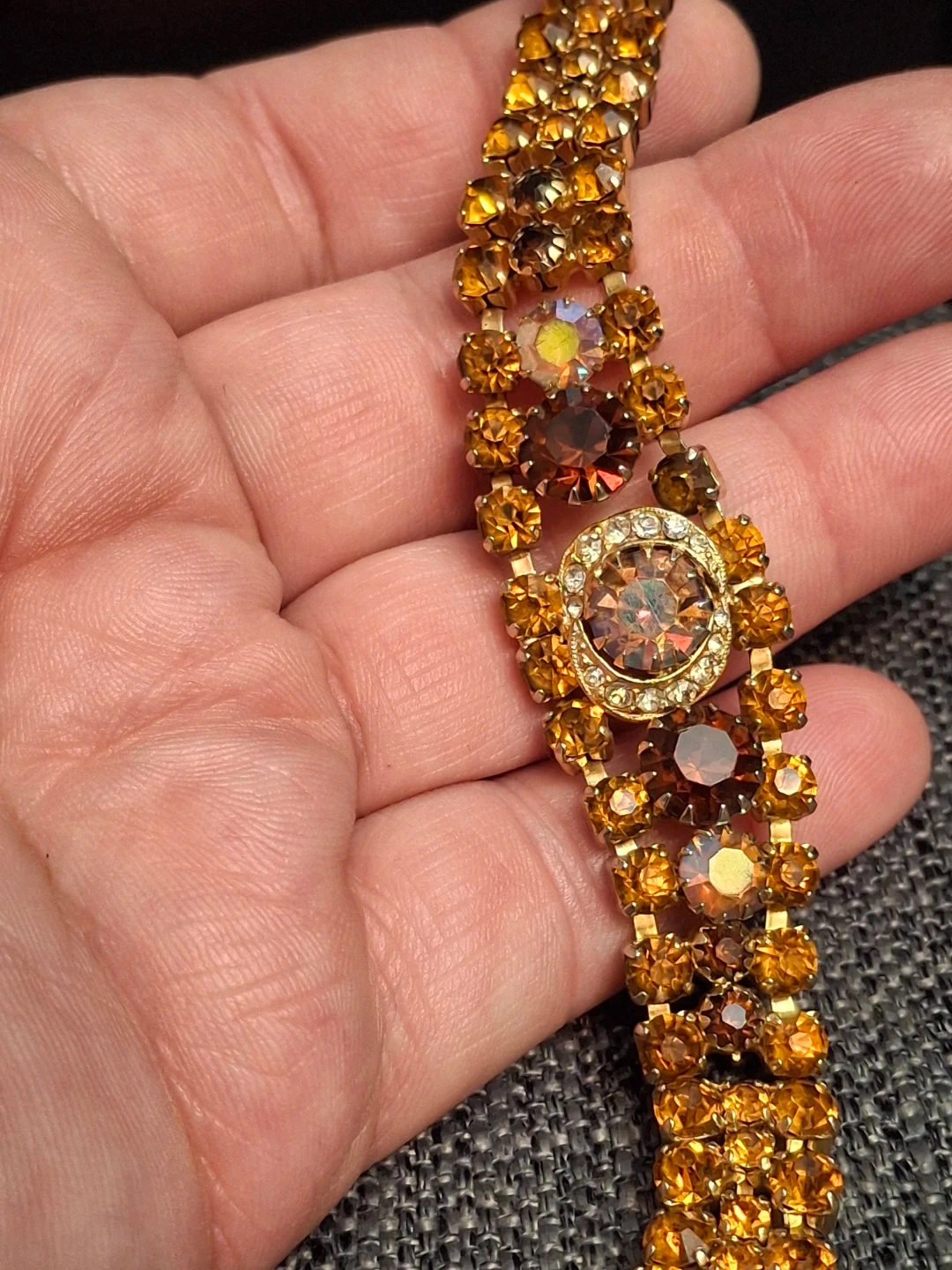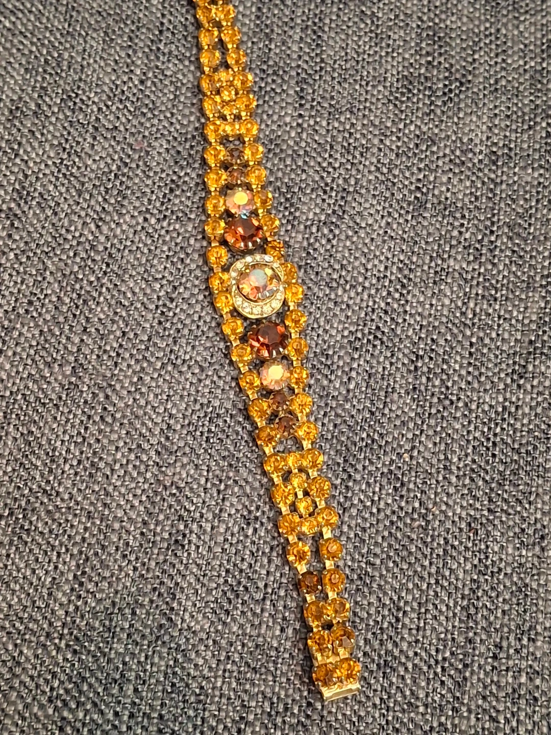 15Selling a beautiful vintage rhinestone bracelet in a gold tone. It's in great condition and would make a lovely addition to any jewelry collection!