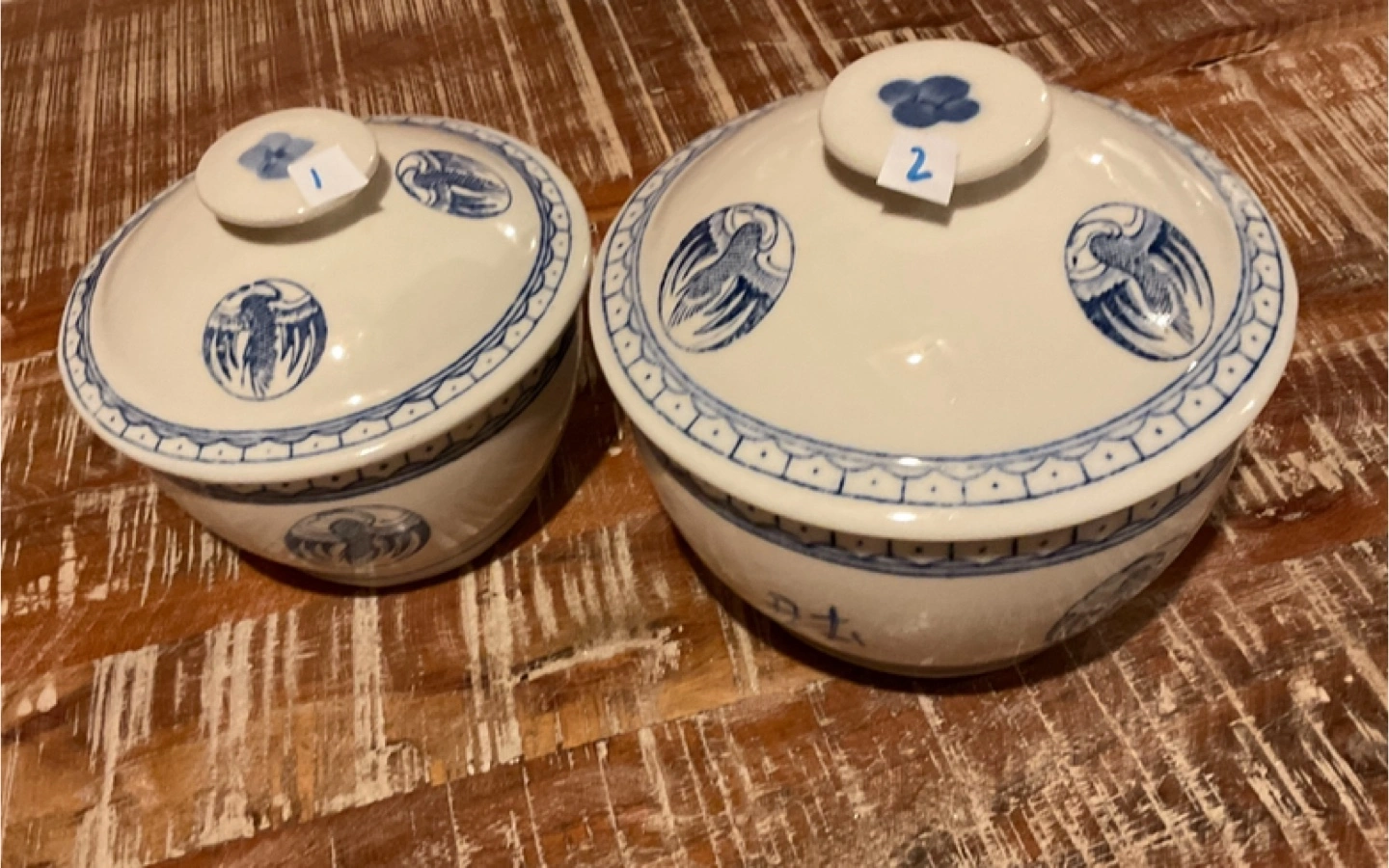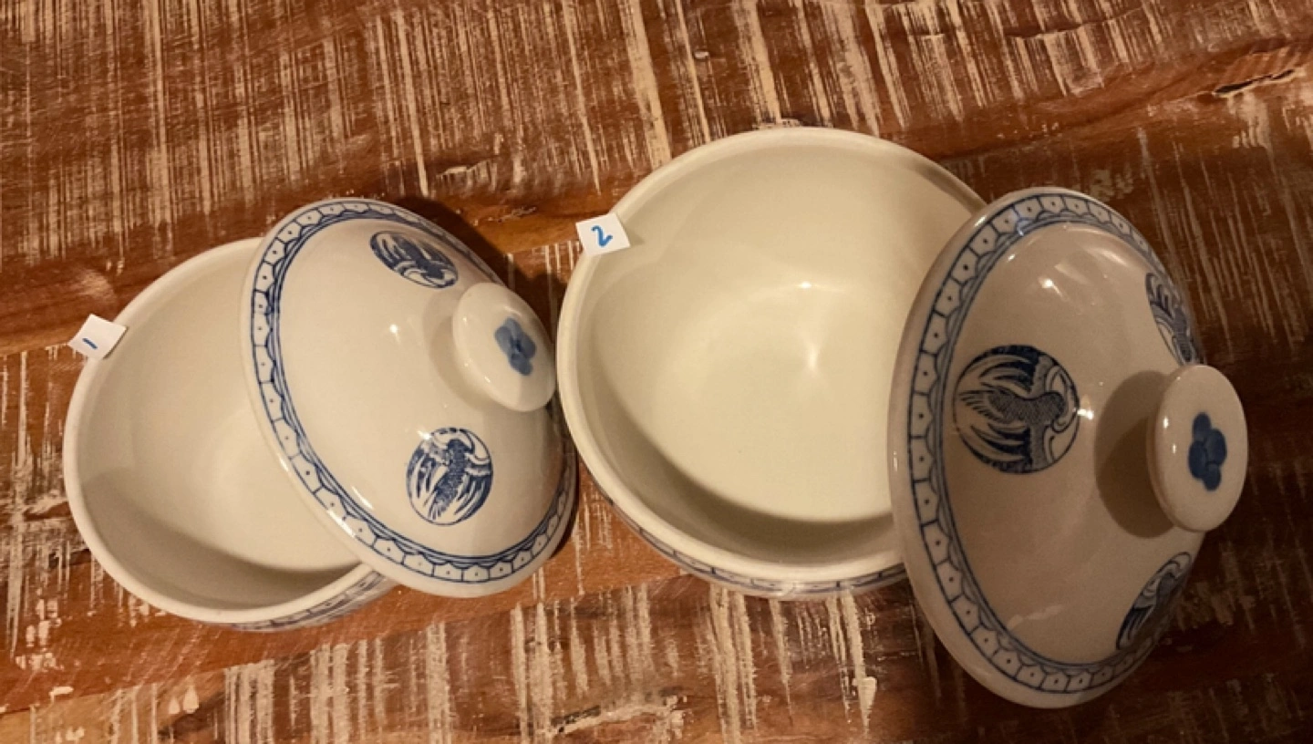 43Selling a set of two vintage rice bowls, complete with their lids! They have a lovely blue and white design, perfect for adding a touch of classic charm to your table. They're in great shape and ready for a new home 1: $45 2: $30