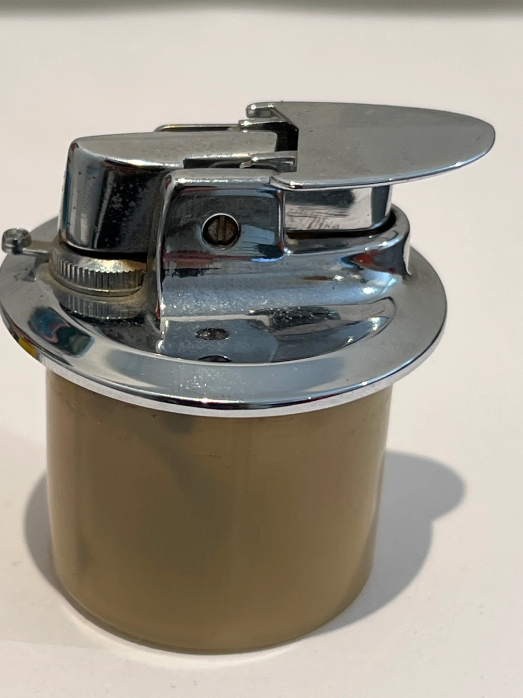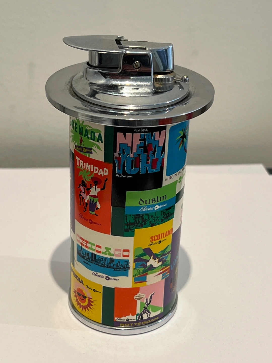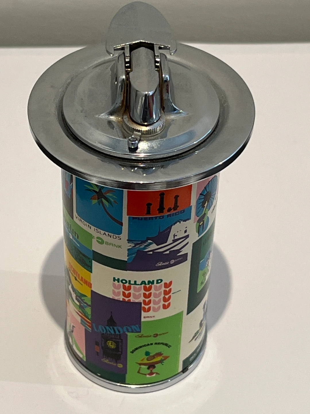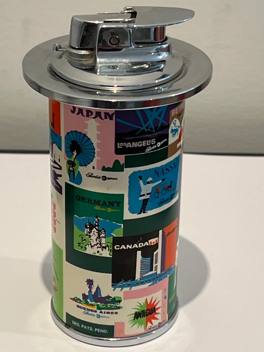 A cool vintage lighter featuring a collage of travel-themed images and locations like Beirut, Nassau, Grenada, Jamaica, and Barbados. A beautiful piece to add to any collection. 5” in height