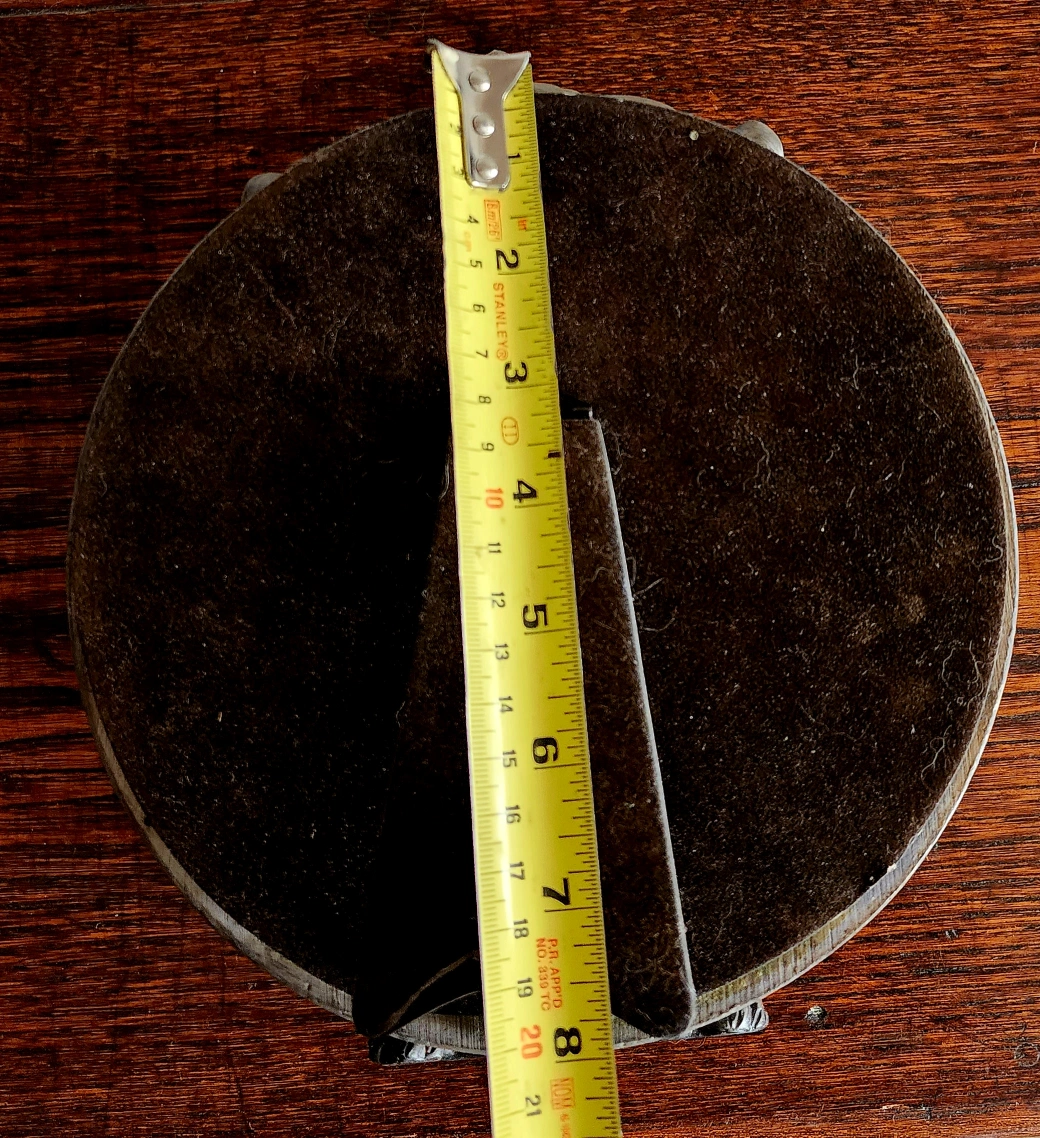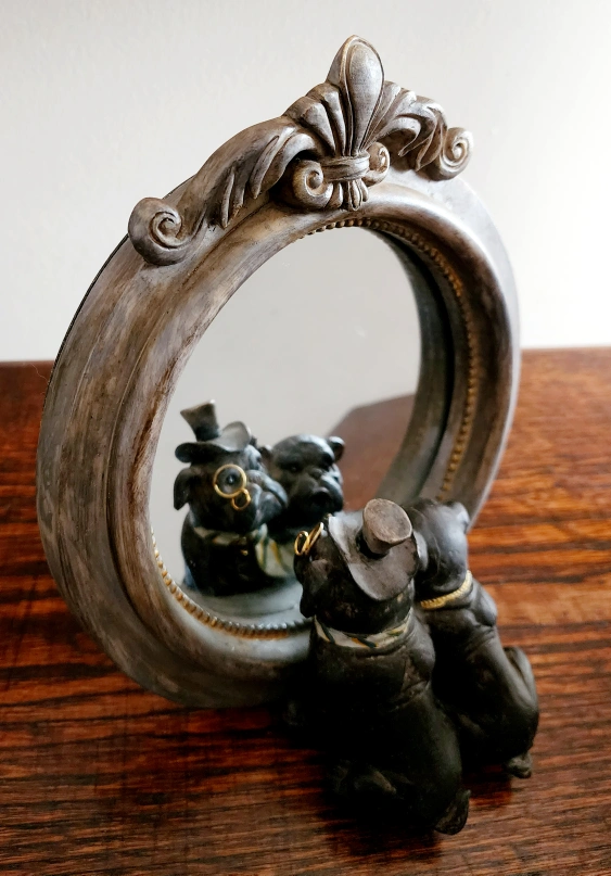 Ornate round mirror. Features two adorable bulldog figurines. Grey-toned frame. Perfect for a vanity or shelf.
