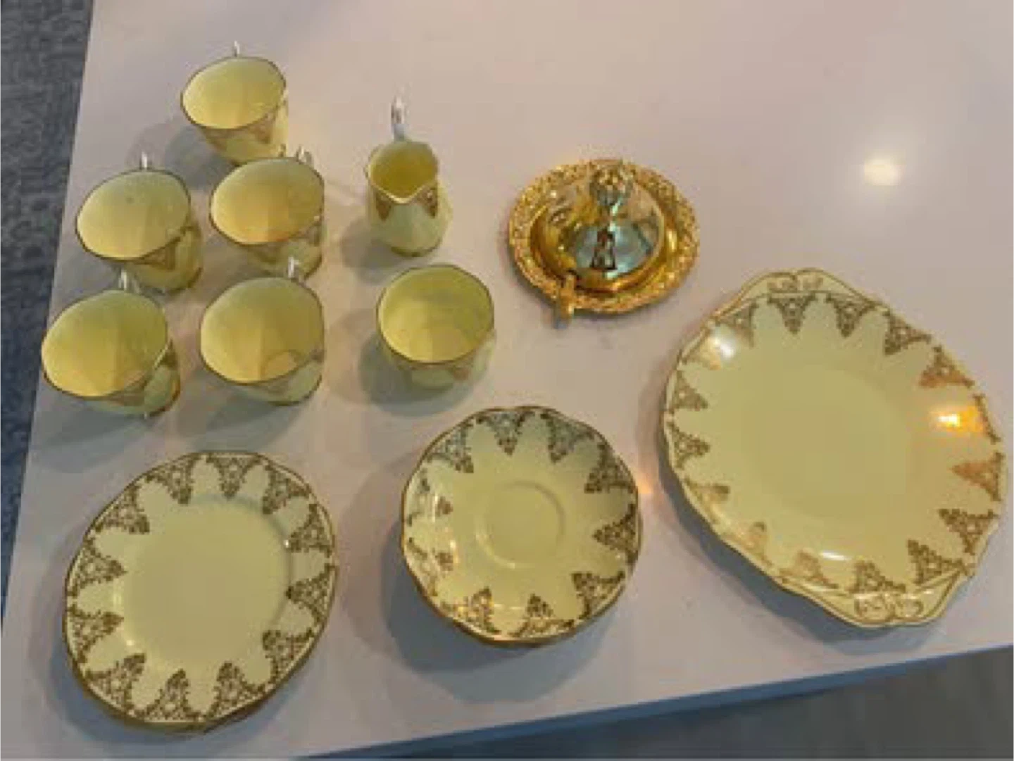 33Selling a lovely vintage Royal Albert bone china tea set. The set features a delicate yellow colour with gold accents. It includes cups, saucers, plates, serving platter, a creamer, sugar dish and a decorative pear shaped butter dish. It was recently unpacked from my grandmother’s belongings. Perfect for adding a touch of elegance to your tea time.