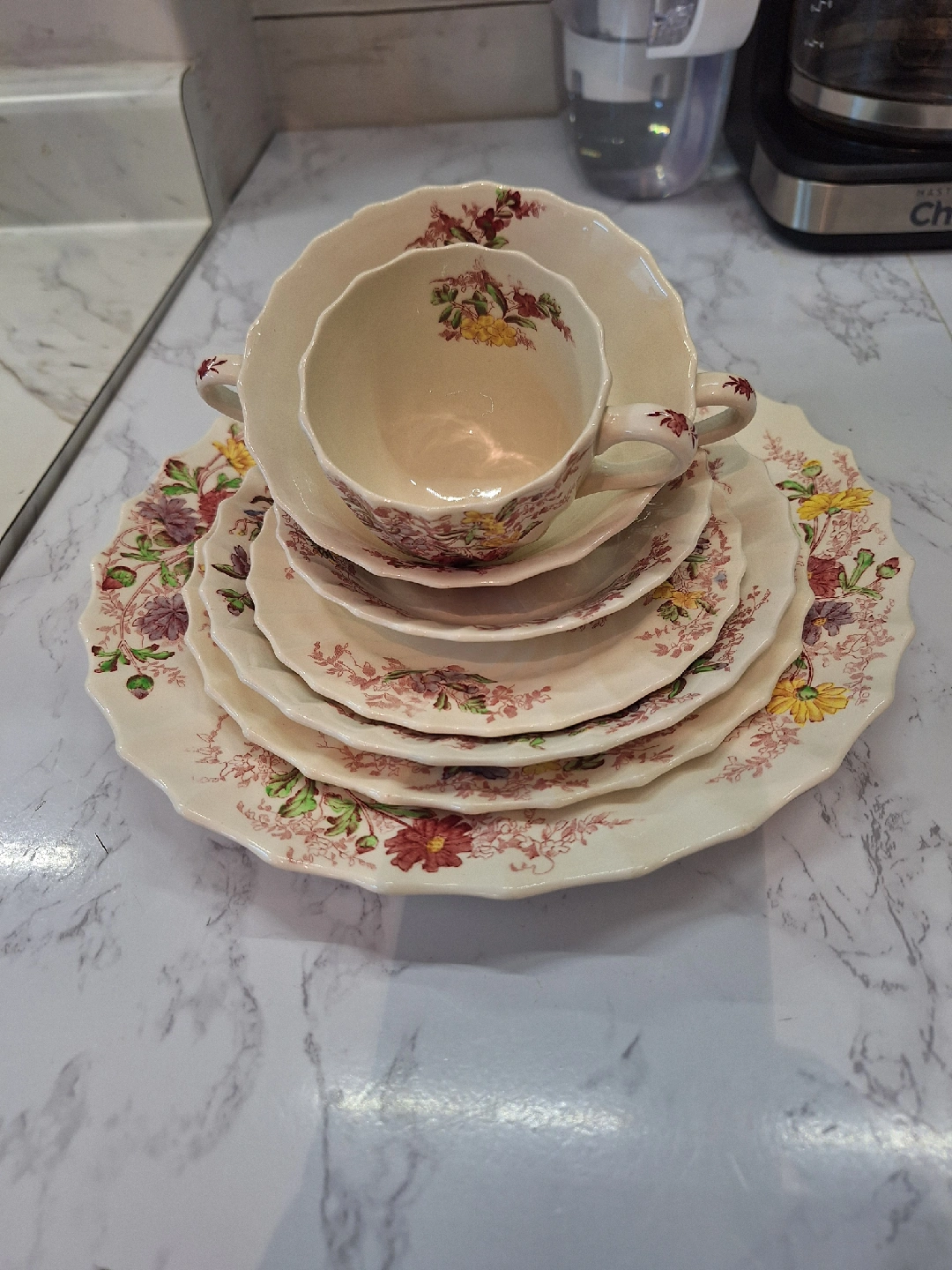 A beautiful vintage Royal Albert Petit Point tea set! Includes a teacup, saucer, and several plates. The floral pattern is so lovely and would be a great addition to any collection or a charming way to serve tea