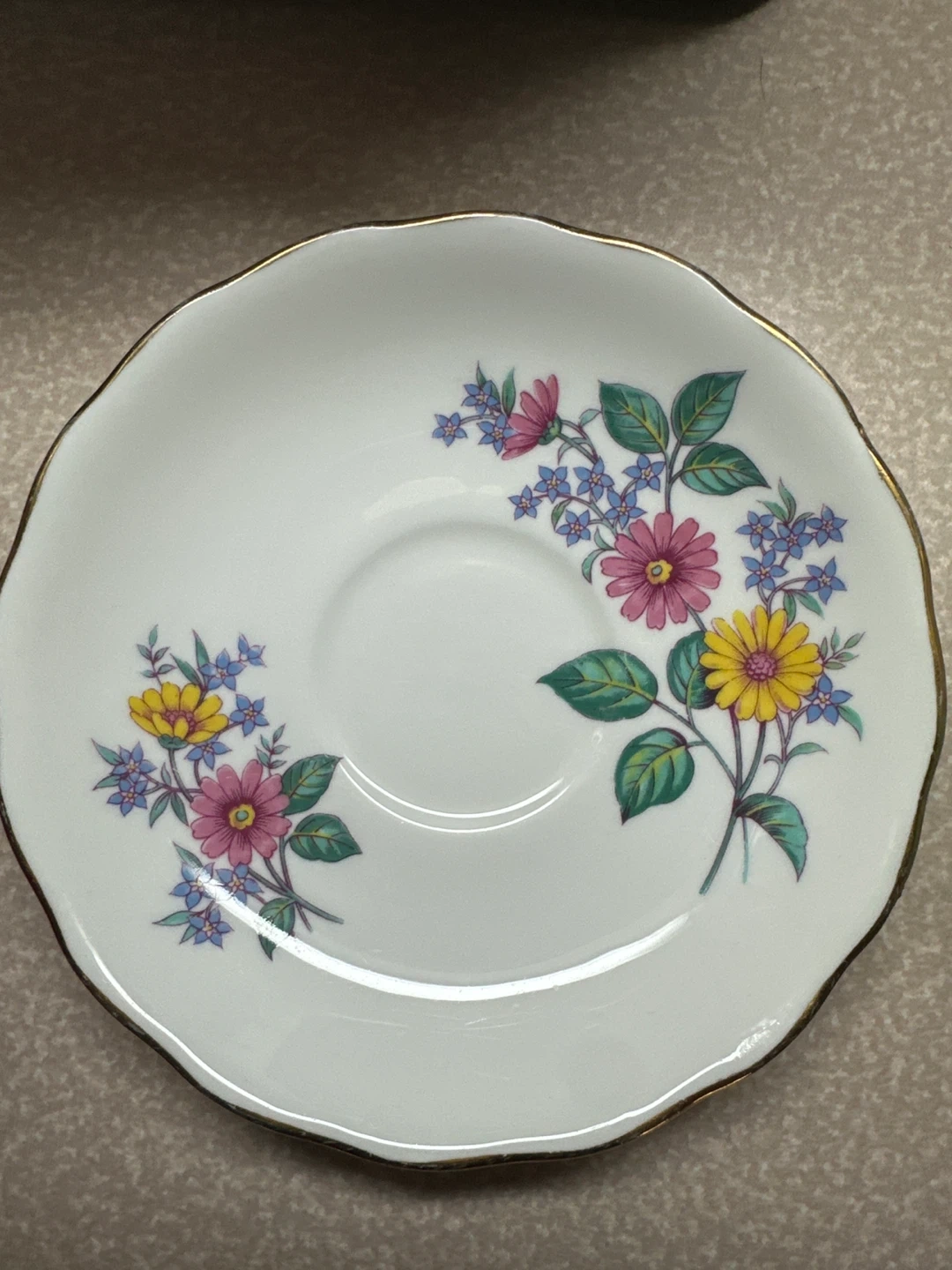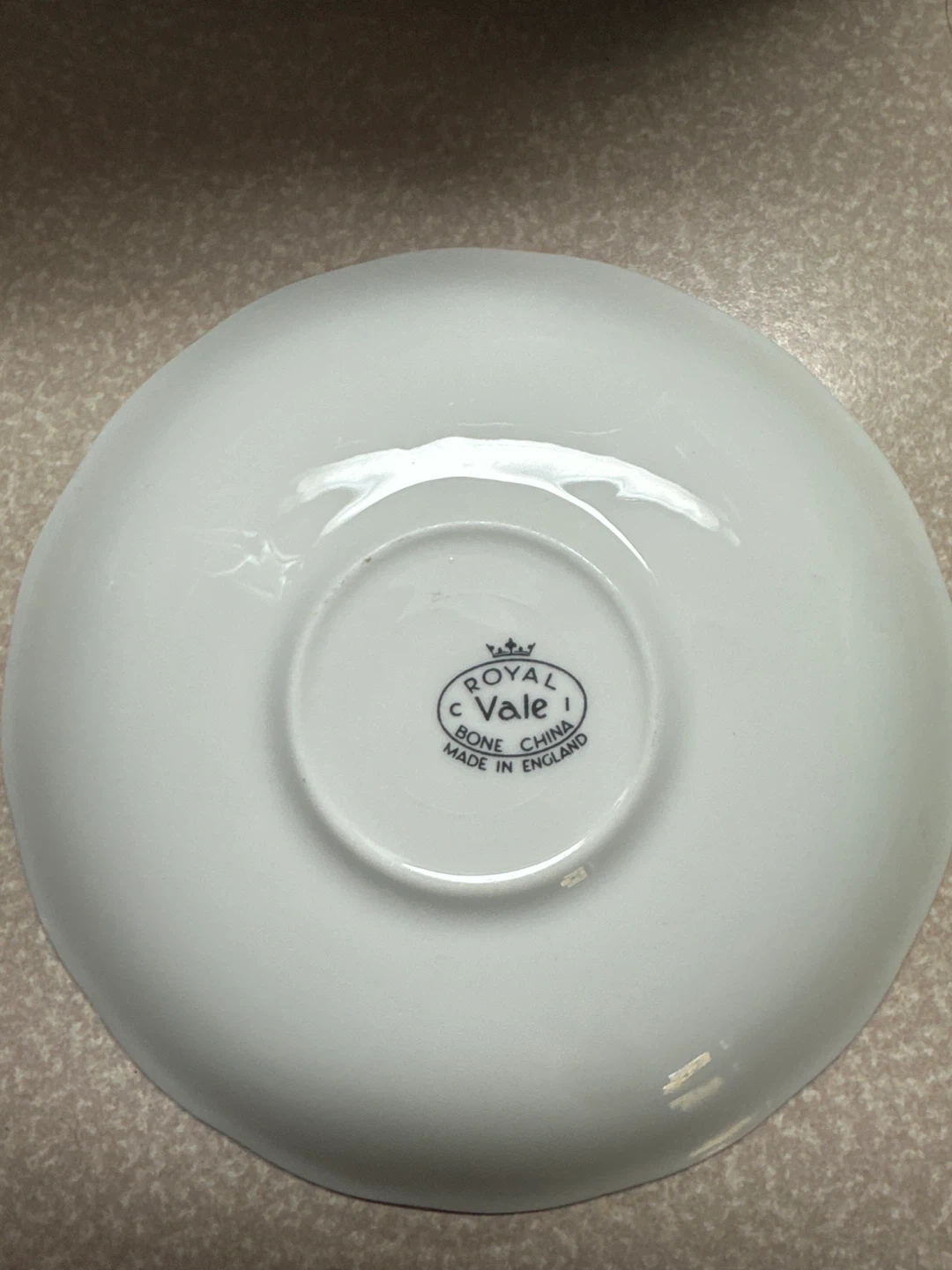 81Selling TWO 2 Royal Vale Bone China saucers. They are in great shape and feature a lovely floral daisy design with a gold trim. Perfect for completing your tea set or adding a touch of elegance to your table!