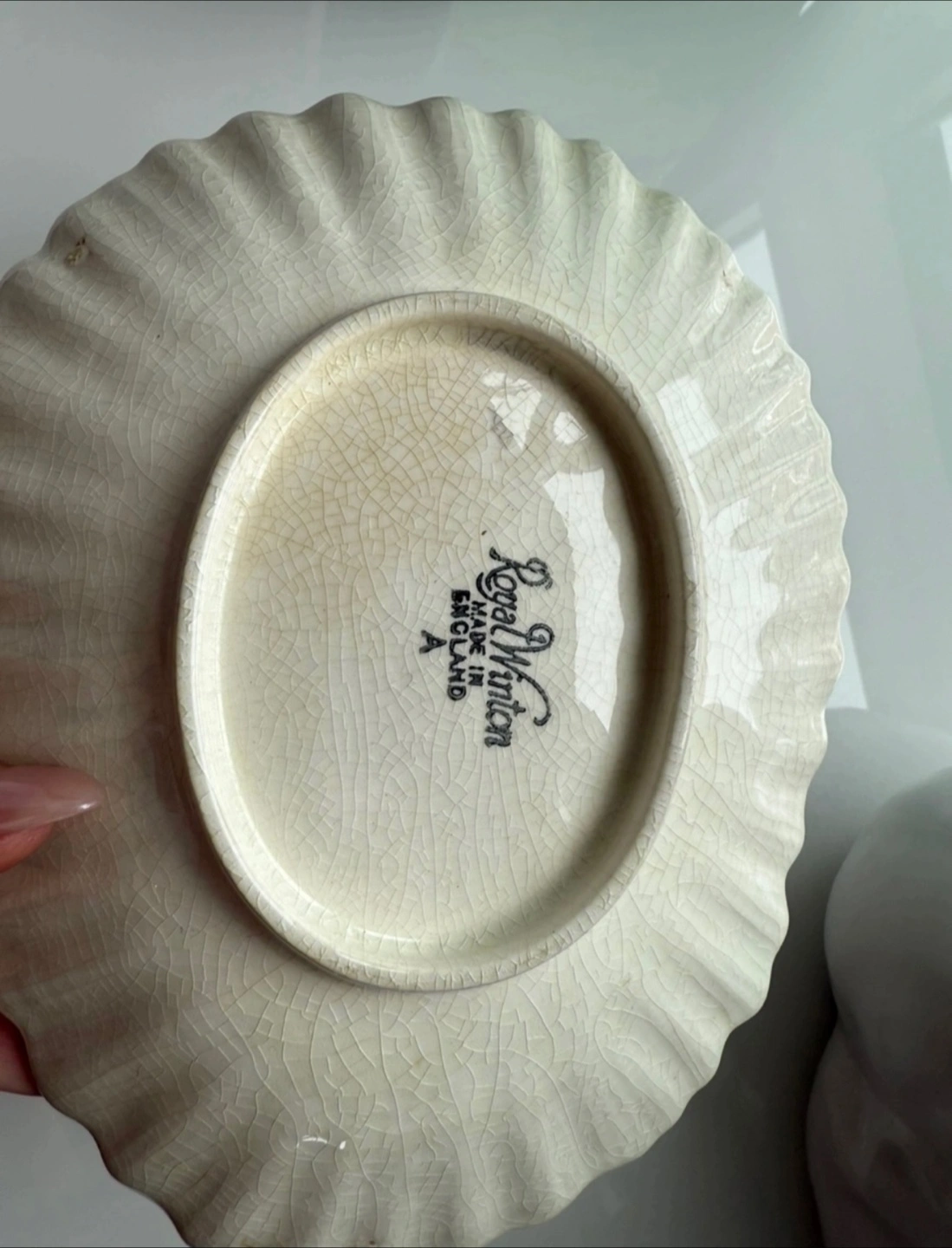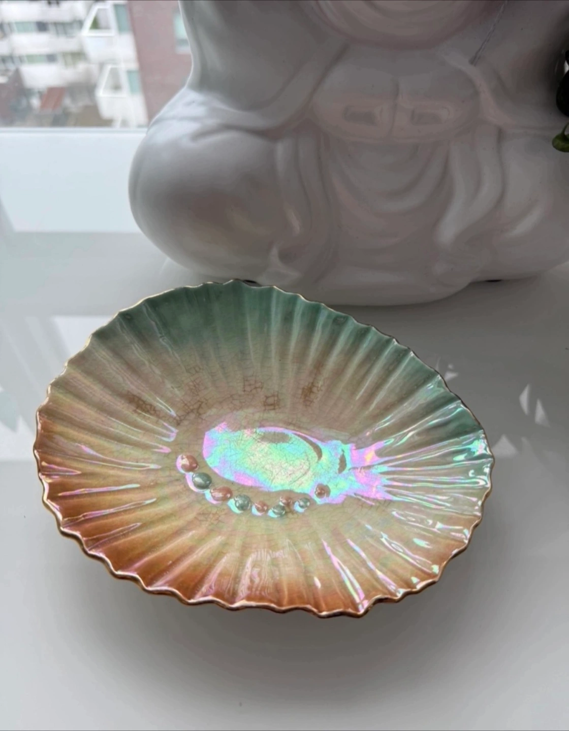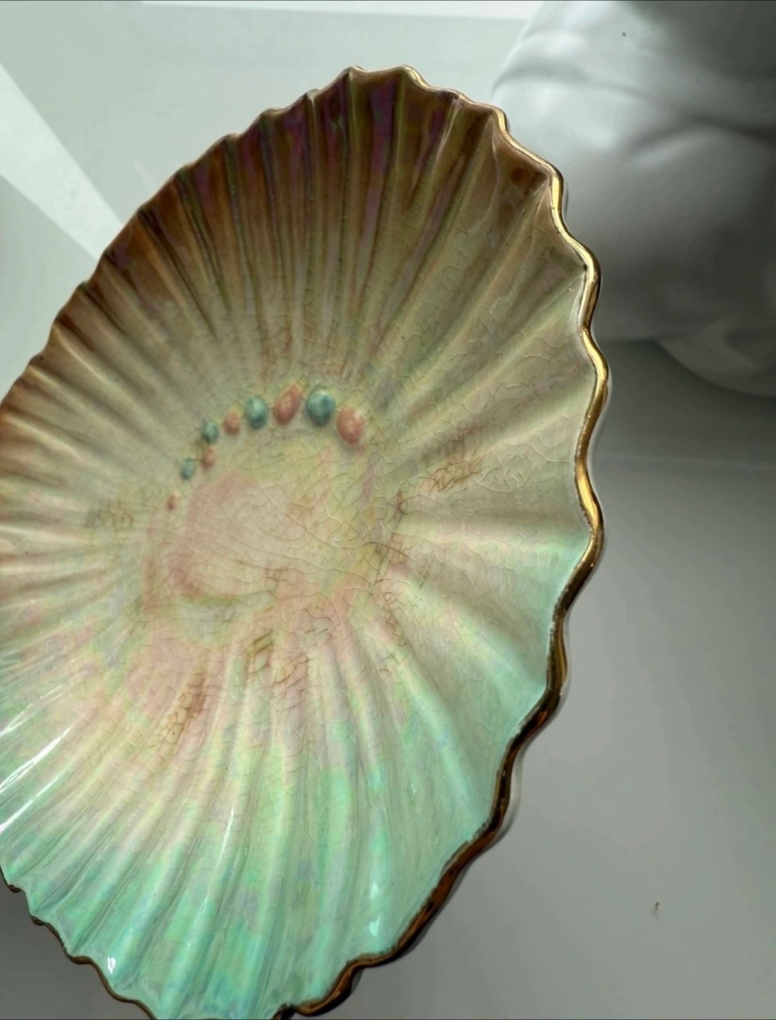 1000+Small decorative dish. Shell-shaped with iridescent glaze. Gold-trimmed edge. Made in England. Shows some crazing. $5 minimum spend to arrange pick up🙂