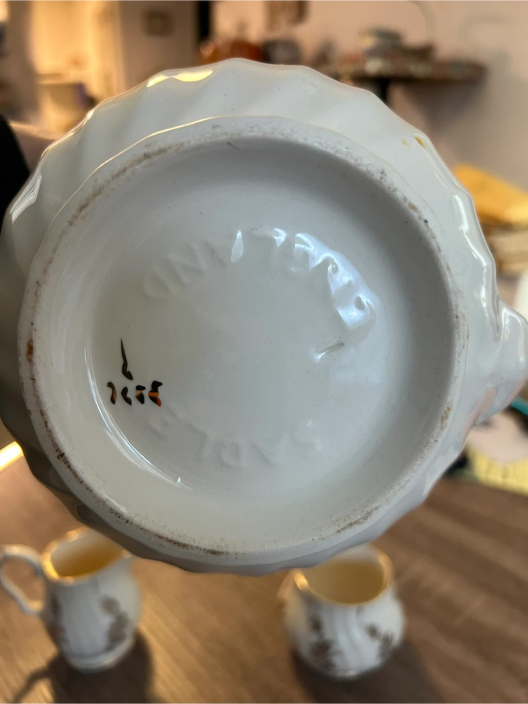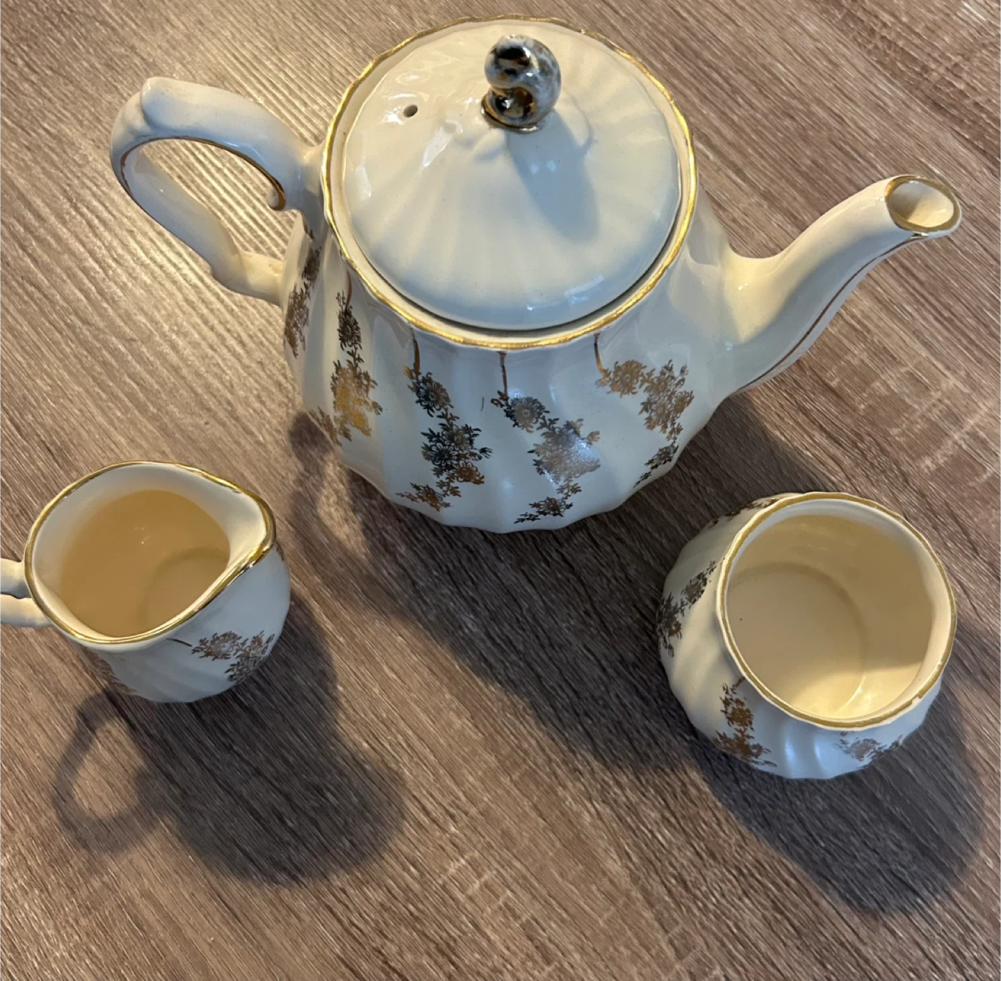 65Vintage James Sadler teapot with a gold chintz floral pattern and gold trim. James Sadler & Sons Ltd. was a renowned English pottery company founded in 1882 in Stoke-on-Trent, England, which was the historic center of the UK pottery industry