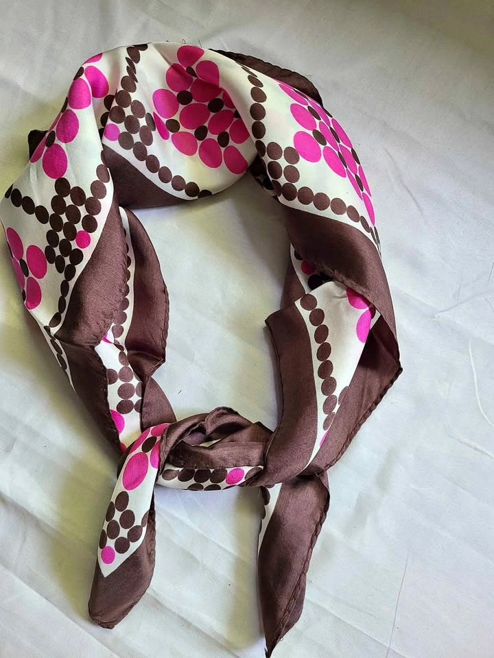 Vintage Ladies scarf. Pink, dark brown and ivory. 27in square. Pick up near Lou's Grill in Abbotsford.