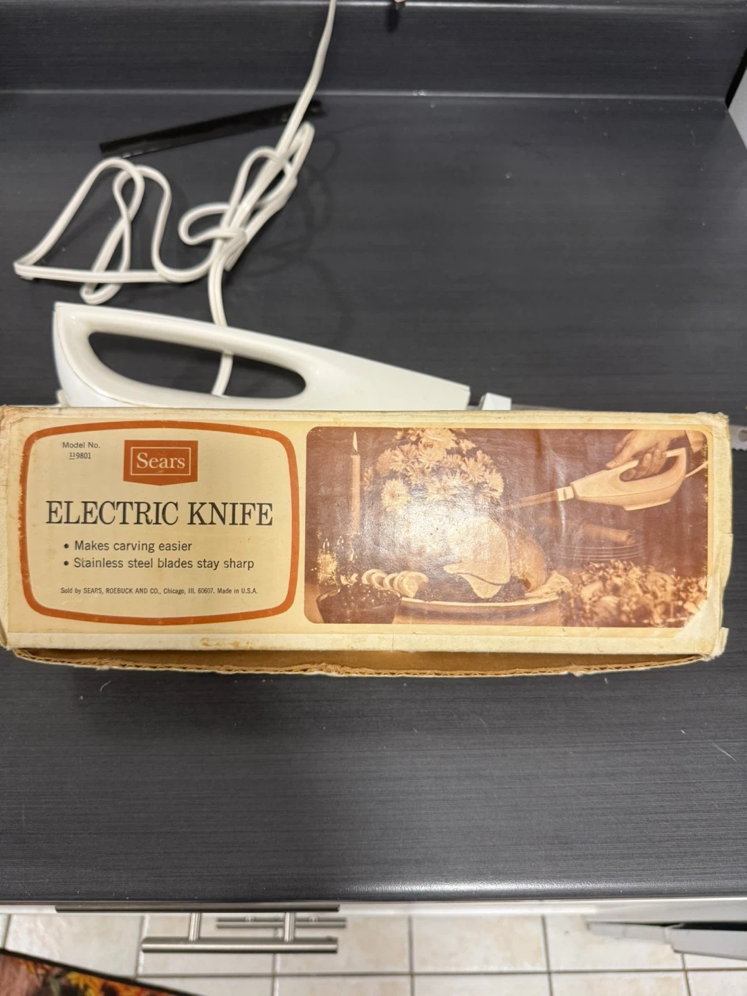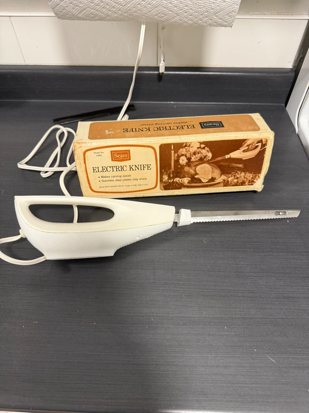 146Selling a vintage Sears Electric Knife, model number 219601. It comes with its original box and an instruction manual. The box mentions that it makes carving easier and that the stainless steel blades stay sharp. A great classic kitchen tool! Pick up at Frobisher lane.