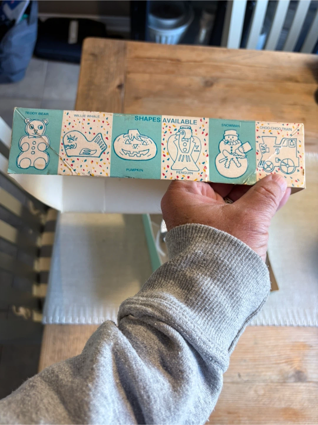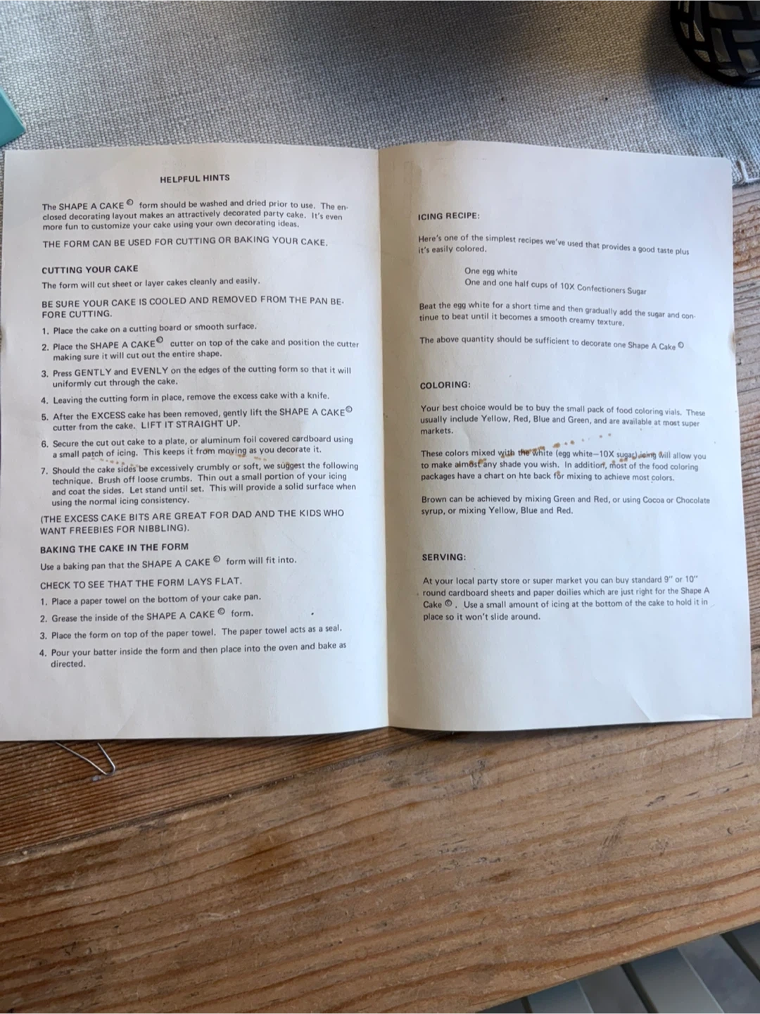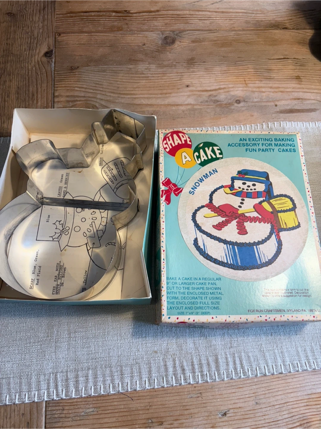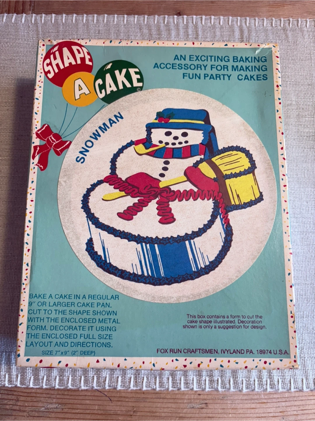98Shape A Cake snowman baking pan for making fun party cakes! The box contains a form to cut the cake shape illustrated. Size 7" x 9" (2" deep). Easy to follow directions enclosed