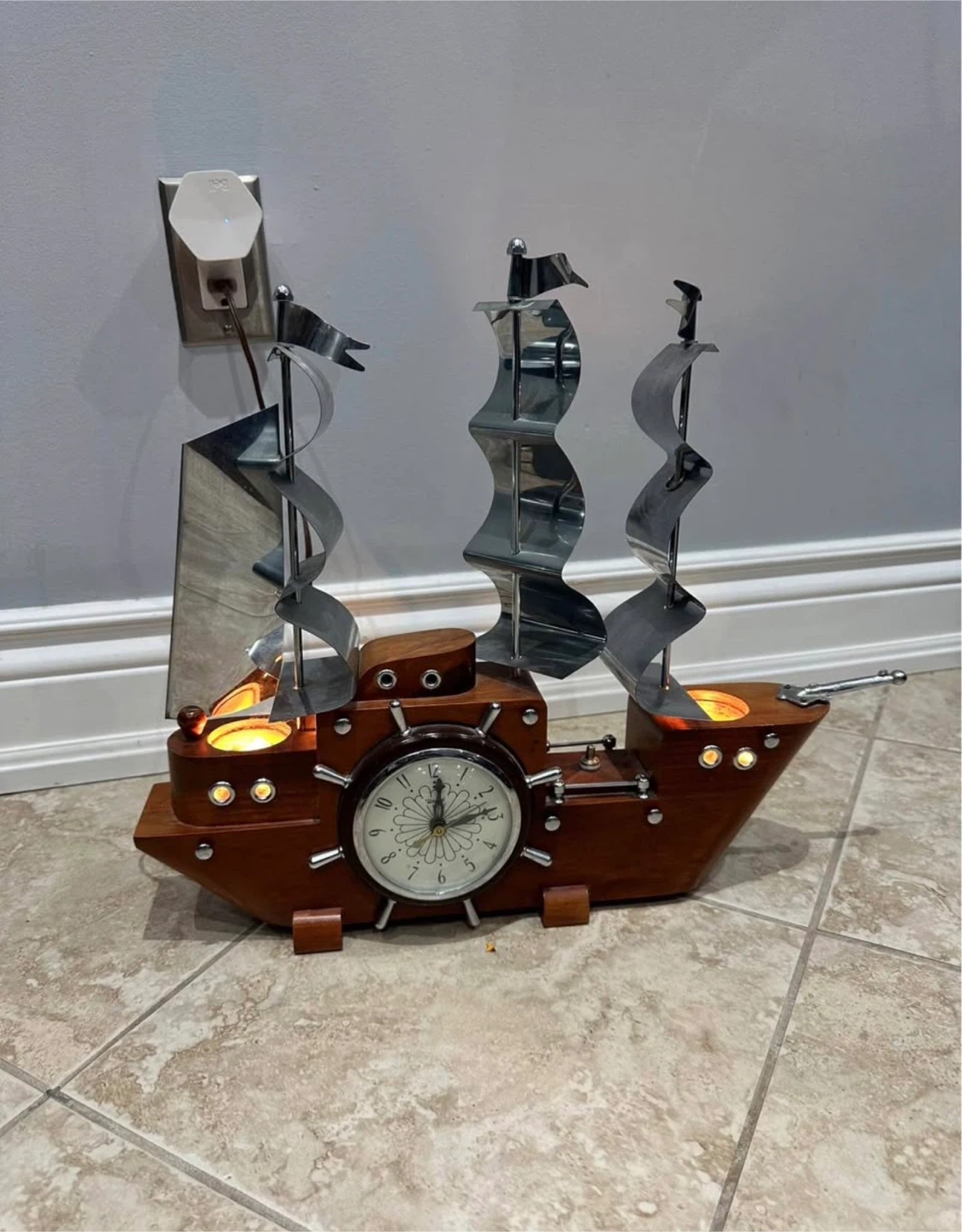 88Unique vintage ship-shaped clock! It's a charming decorative piece that also tells time. The clock is integrated into the ship's wheel, and it features metal sails and a wooden base. A cool addition to any room!