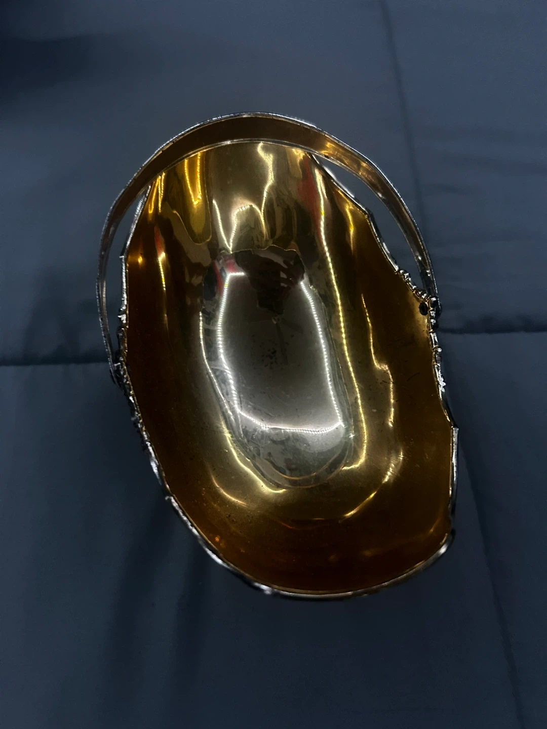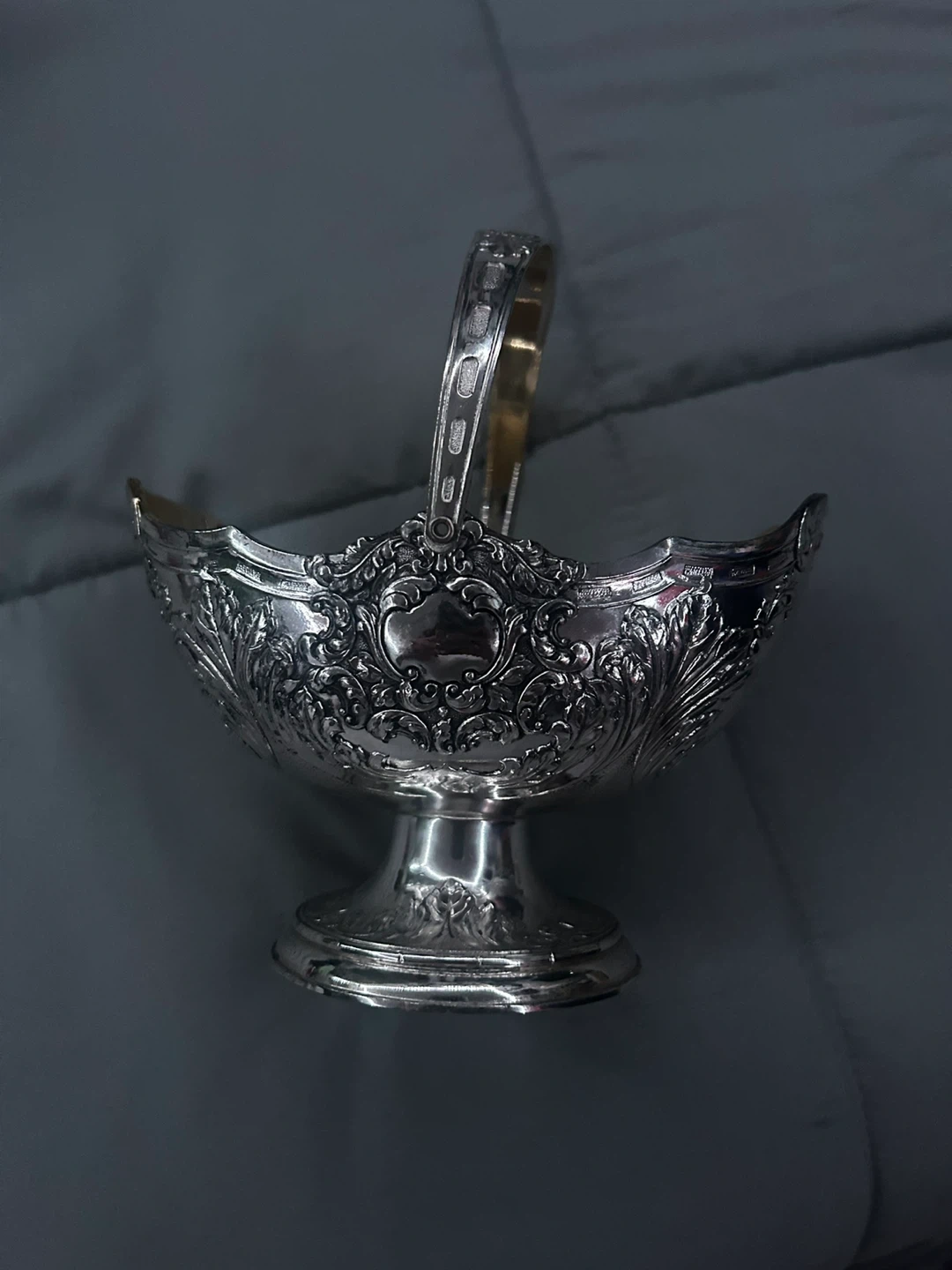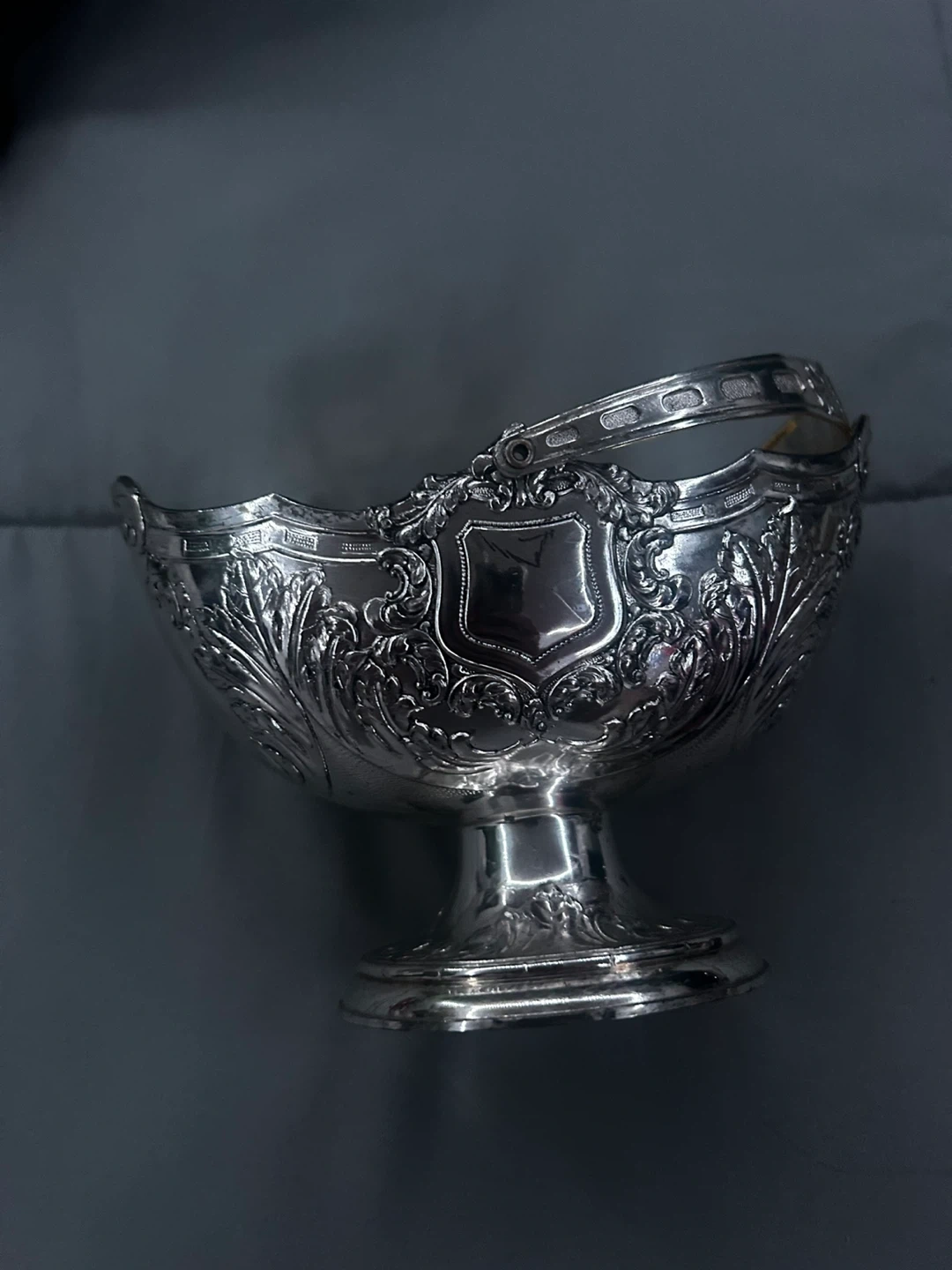 60Selling a vintage silver basket featuring a handle and ornate detailing. The basket has a beautiful design, perfect for adding a touch of elegance to any space