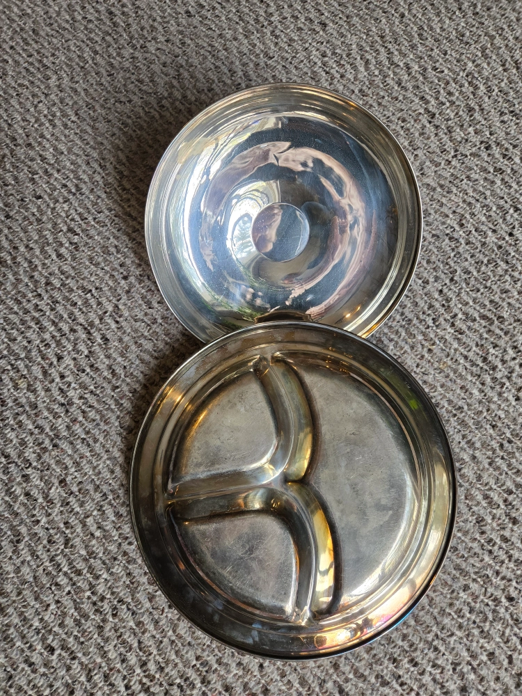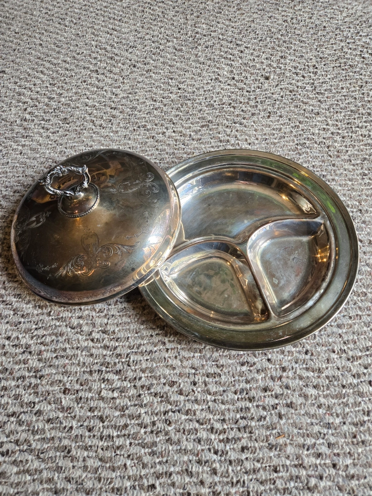 Selling a vintage silver plated serving dish with a lid. It has a divided section, perfect for serving multiple items at once. The lid has a decorative handle. It's in good condition for its age, with some signs of wear and tarnish that add to its vintage charm
