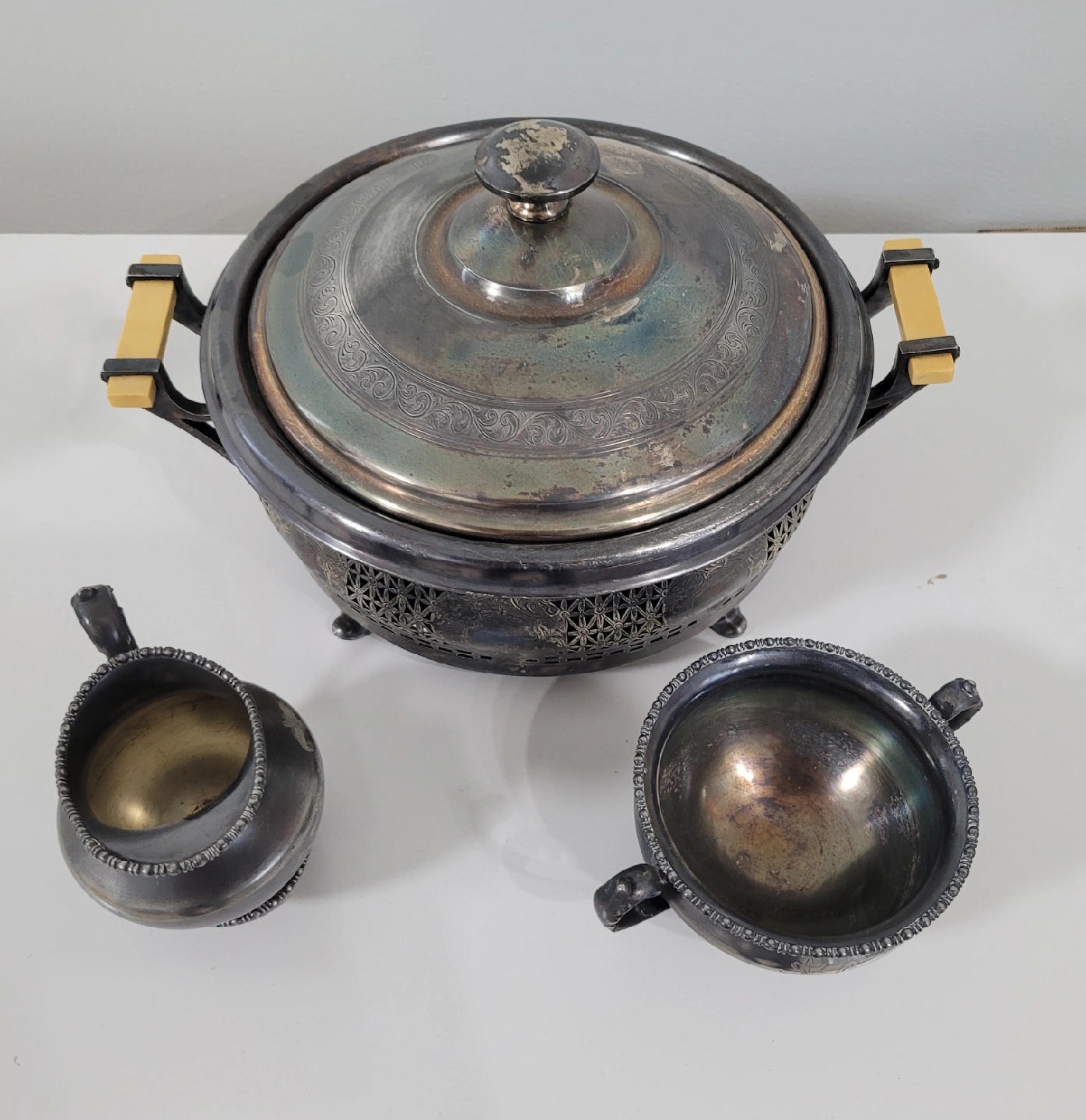 170Selling a vintage silver plated serving set. It includes a lidded serving dish, a creamer, and a sugar bowl. The set shows some signs of wear and tarnish, adding to its antique charm. Perfect for adding a touch of elegance to your table!