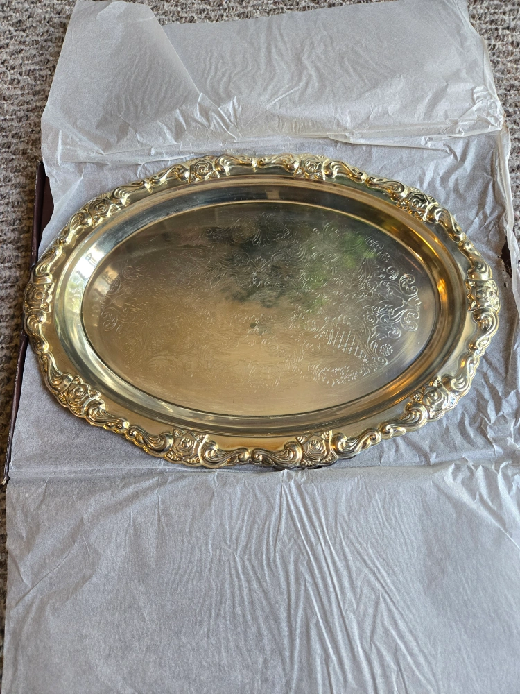 Selling a vintage silver plated serving tray. It has a beautiful ornate design around the edges and comes in its original box. Perfect for serving or display