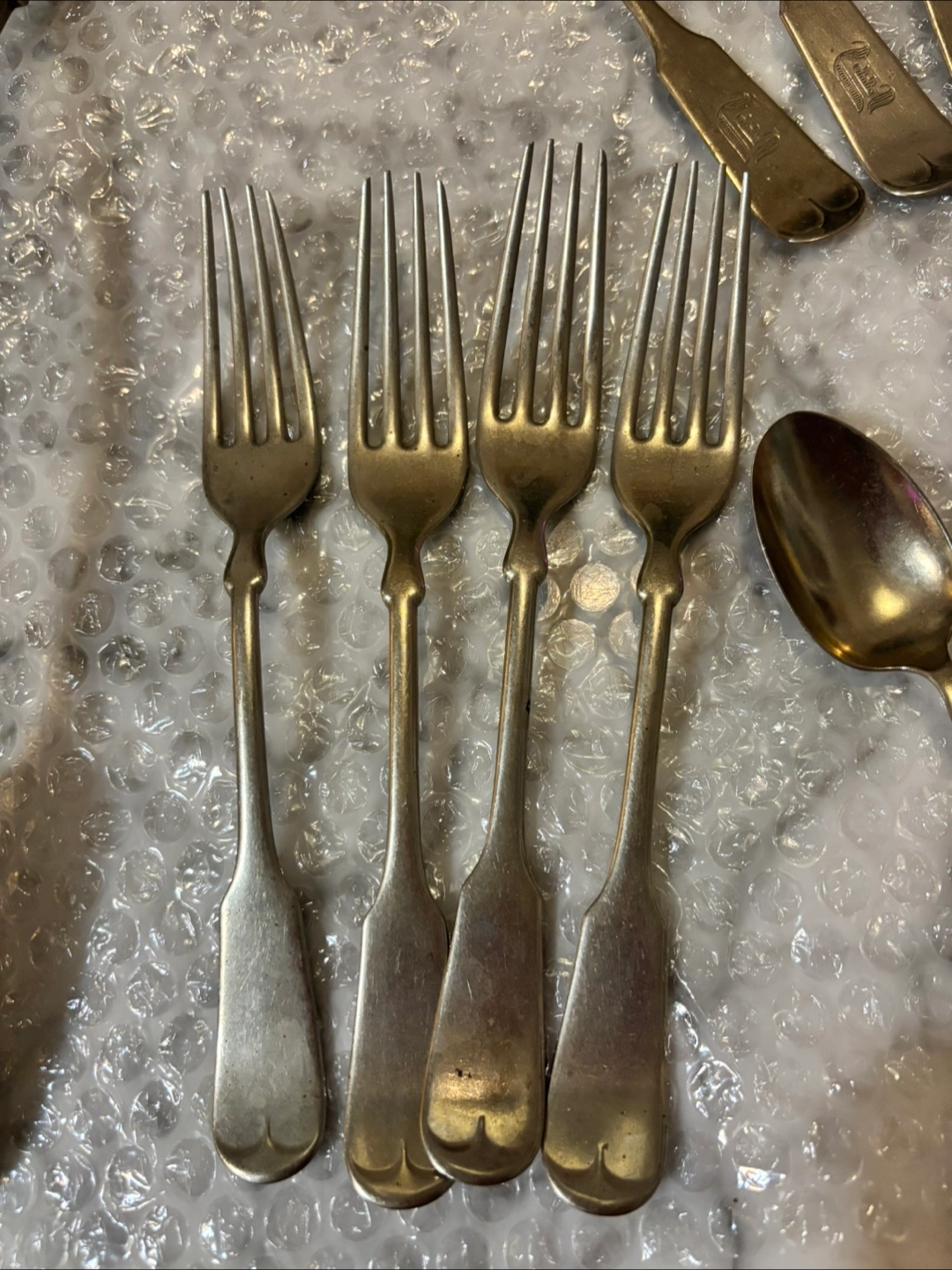 Selling a vintage silverware set! Includes forks and spoons with distinct initial engravings. Perfect for adding a touch of antique charm to your table setting. Some wear and patina consistent with age.