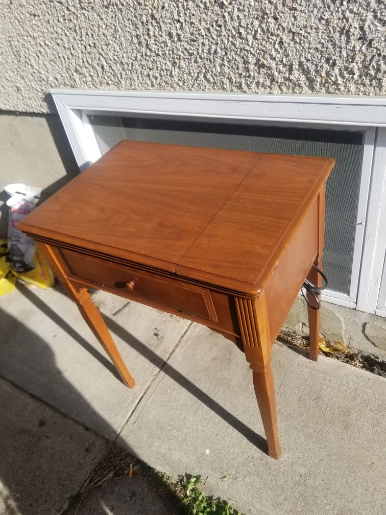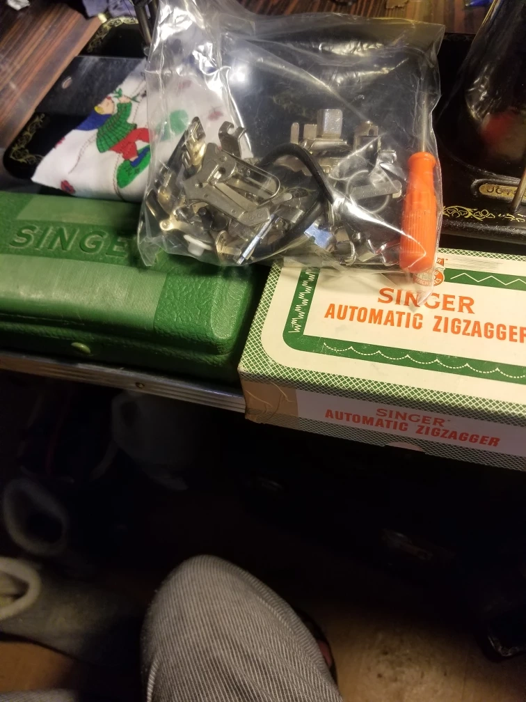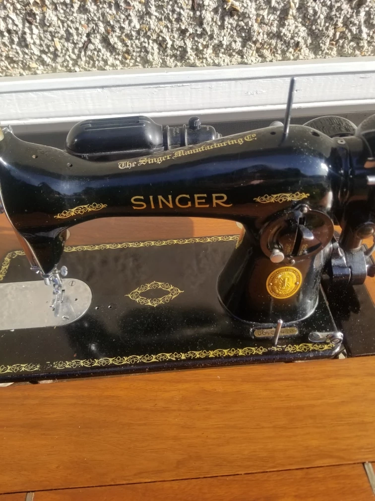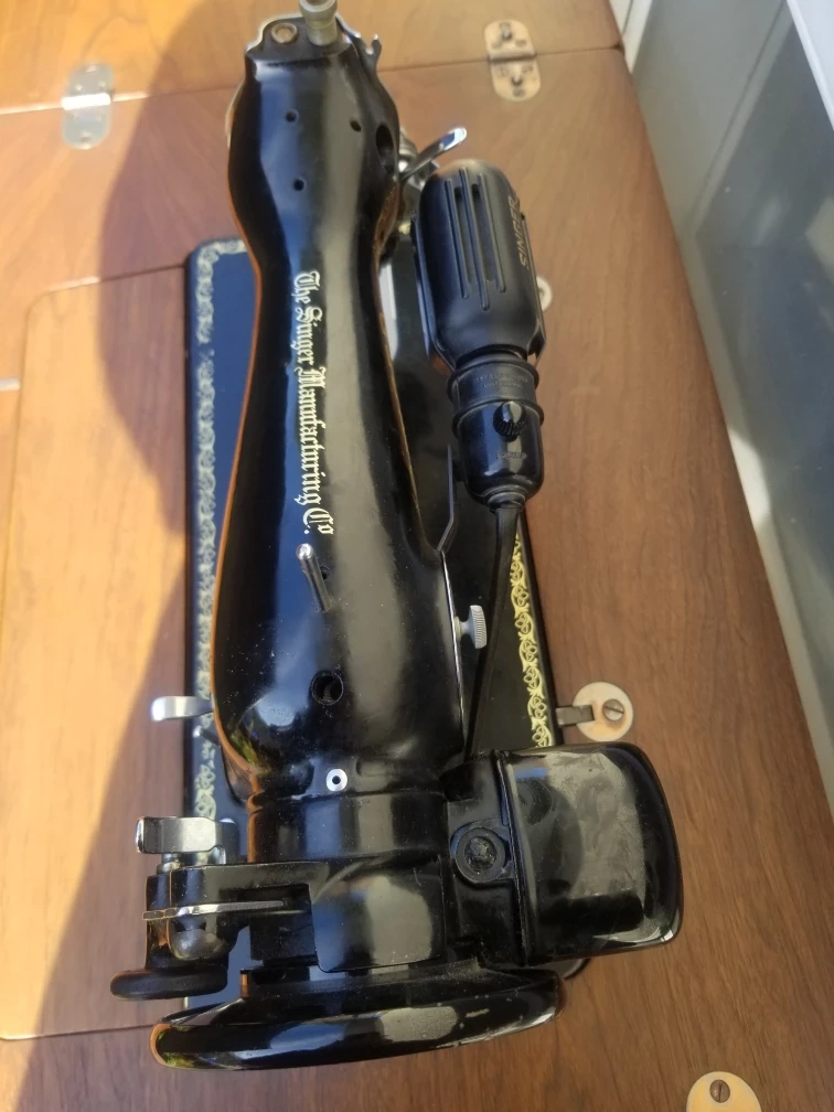 Vintage Singer 15-91 Sewing Machine with cabinet and foot pedal. Includes a variety of accessories and stool