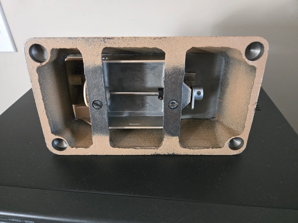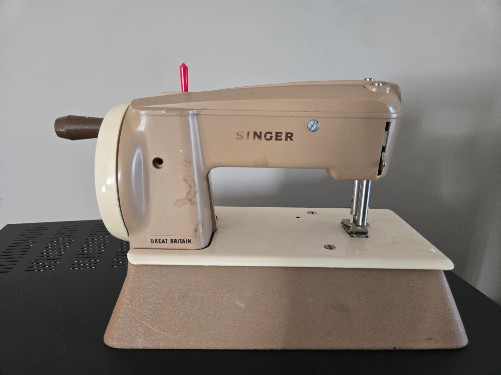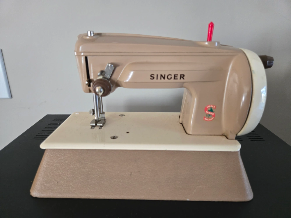 Selling a vintage Singer sewing machine. It has a tan and cream colour scheme. There are some signs of wear, but it's still a cool piece!
