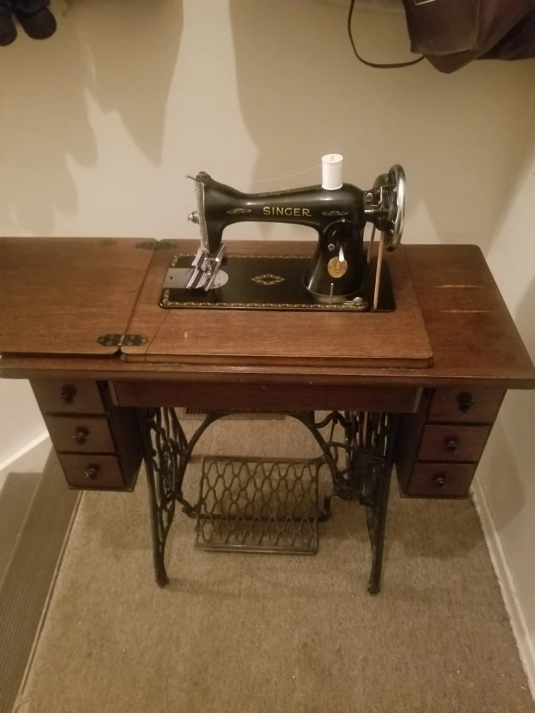Vintage 15-88 Treadle Singer sewing machine. Wooden cabinet with drawers. Great for collectors or sewing enthusiasts.