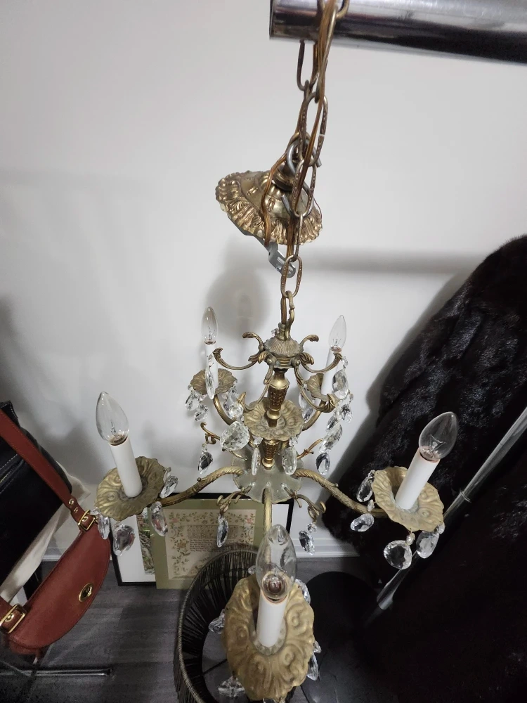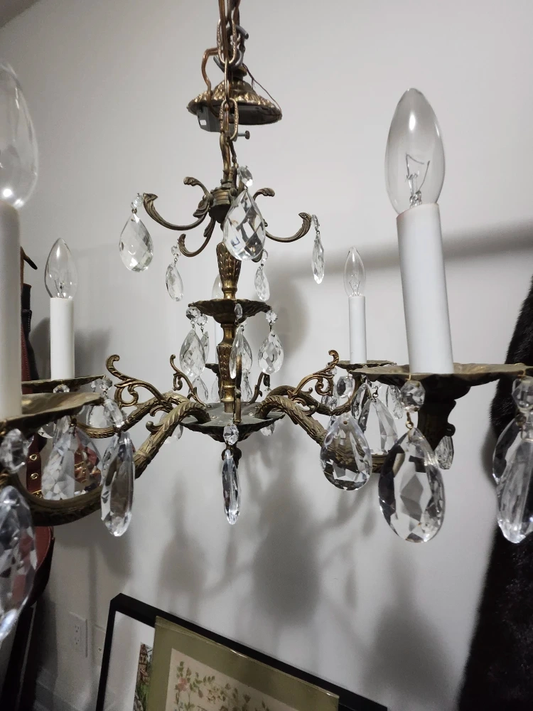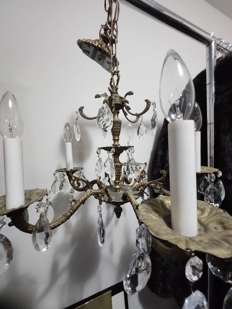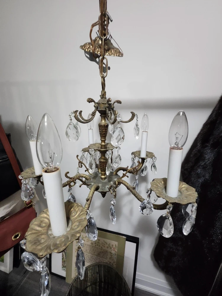26Selling vintage spanish brass chandelier with complete crystal accents, 3 layers with 5 lights. Clean and in good shape, complete parts and heavy.