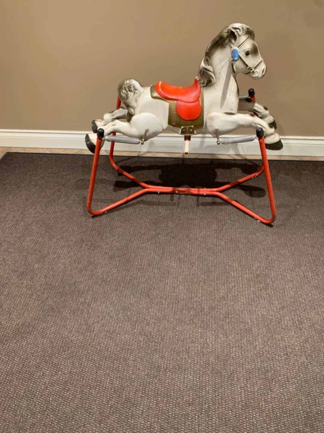 Here's a vintage spring rocking horse! It has a red seat and a red metal frame. The horse itself is white with grey details. It's in good condition for its age and would be a fun addition to any playroom