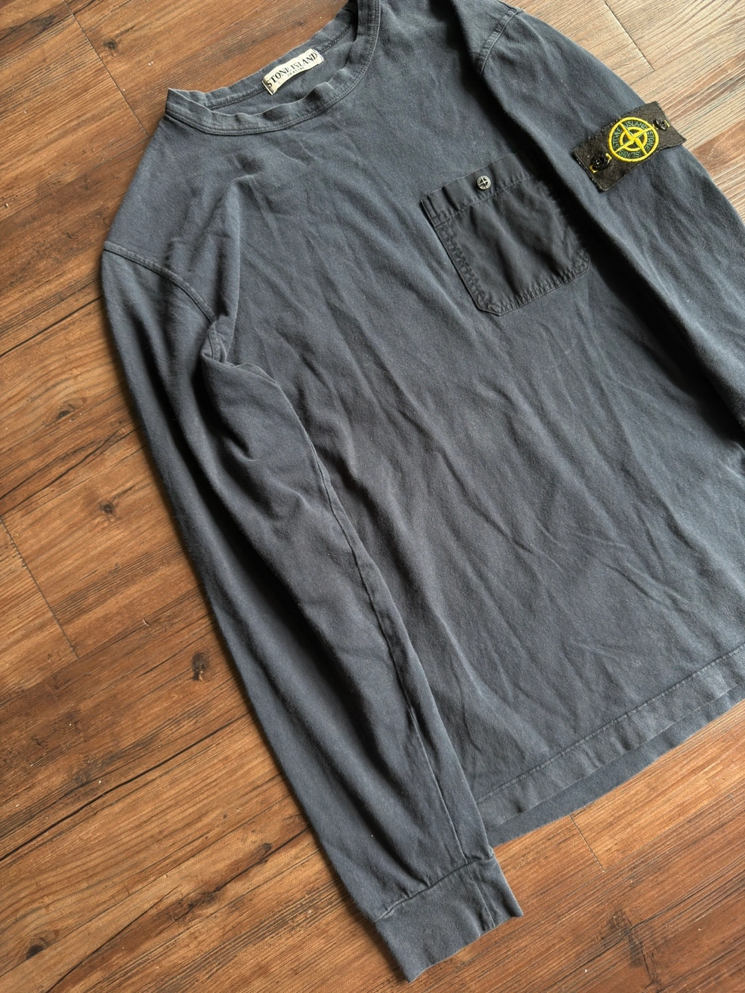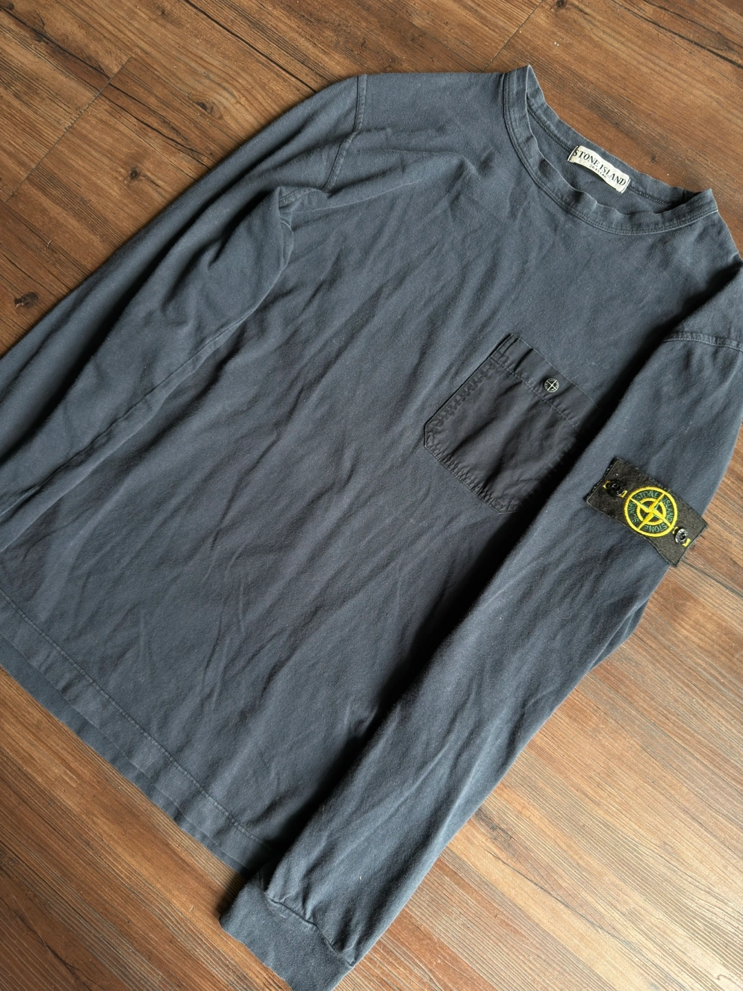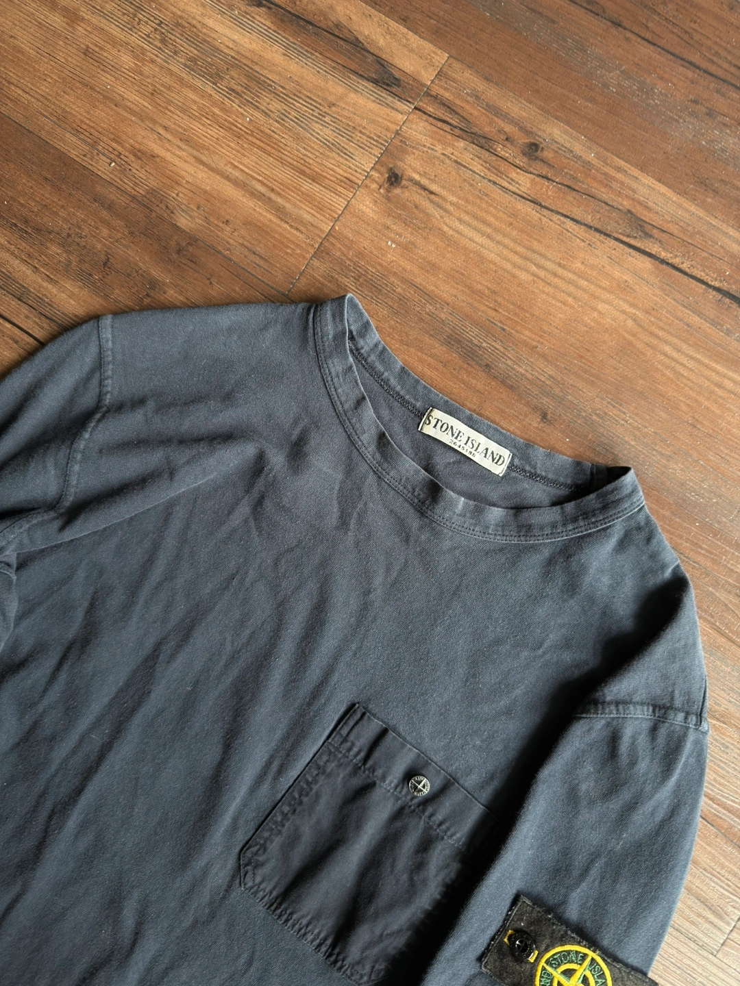 [For Sale] Vintage SS95 Stone Island Utility Long Sleeve — Size L ℹ️ A rare and early piece from Stone Island’s Spring/Summer 1995 season, this garment-dyed long sleeve showcases the brand’s utilitarian design language in its purest form. Crafted in Italy from soft 100% cotton, it features a dyed navy/darkblue colour standout oversized chest pocket secured by a metal snap embossed with the iconic Stone Island compass — a subtle nod to the brand’s technical heritage. What sets this piece apart is the presence of the original removable sleeve badge, a feature seldom seen on lightweight jersey garments from this era. This detail, combined with the Sportswear Company S.p.A. wash tag and archival ART code (551521042/518), places it firmly in the collectible Osti-era lineage — a true vintage rarity almost never seen for sale today. Finished with ribbed cuffs, a soft worn-in fade, and early-90s construction quality throughout. A grail-worthy addition for Stone Island archivists or anyone chasing obscure pieces from the brand’s golden era. 📏 Size: Tagged L — fits true to size 📐Measurements : Length:27 inches Chest:20 inches Shoulders 17 inches Sleeve Length:23 inches ✅ Condition: Very good vintage condition — clean with no holes or damage. Natural fading from age/wash. Badge and metal compass snap intact.