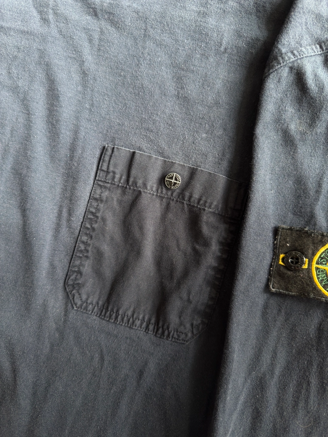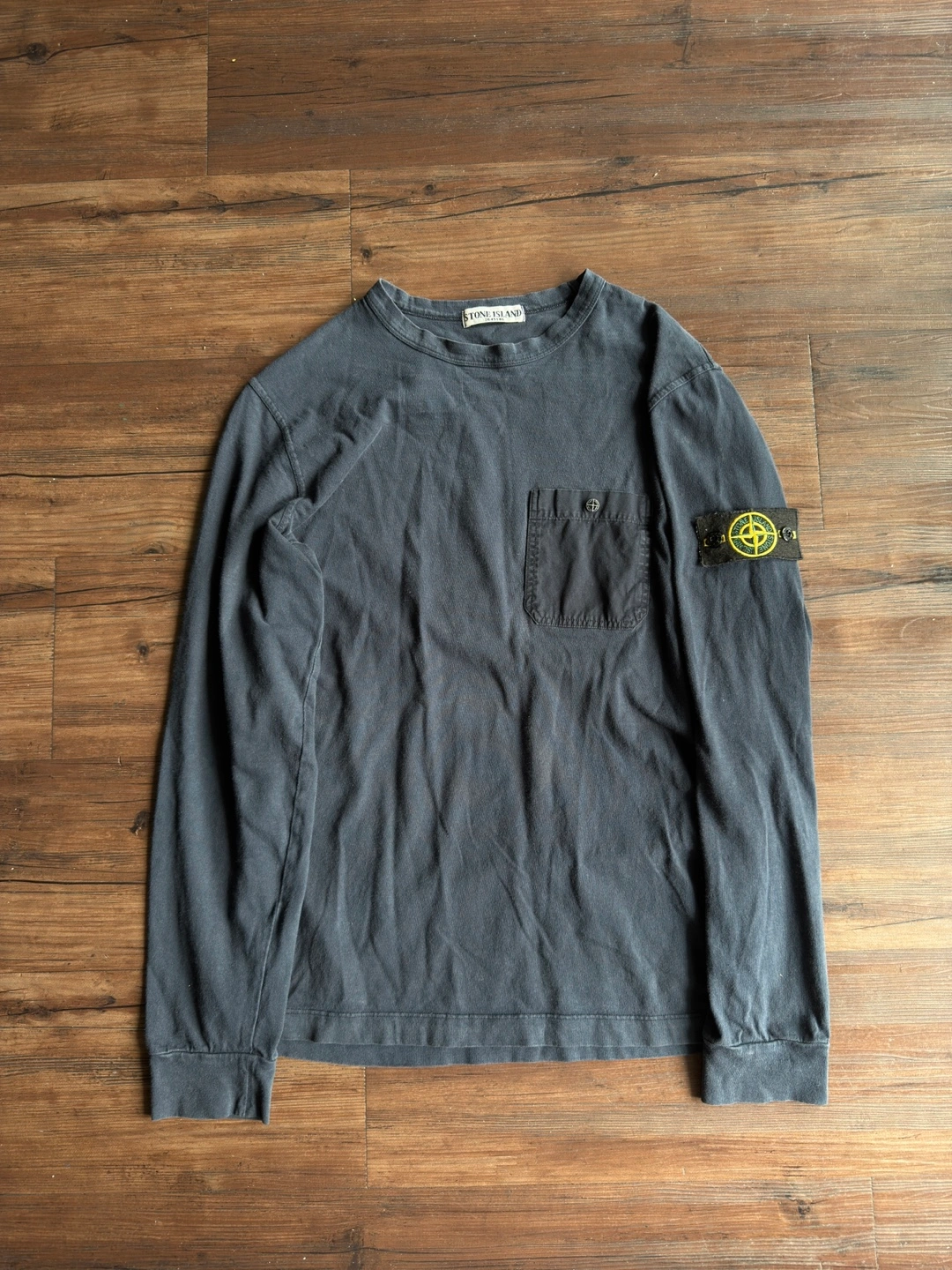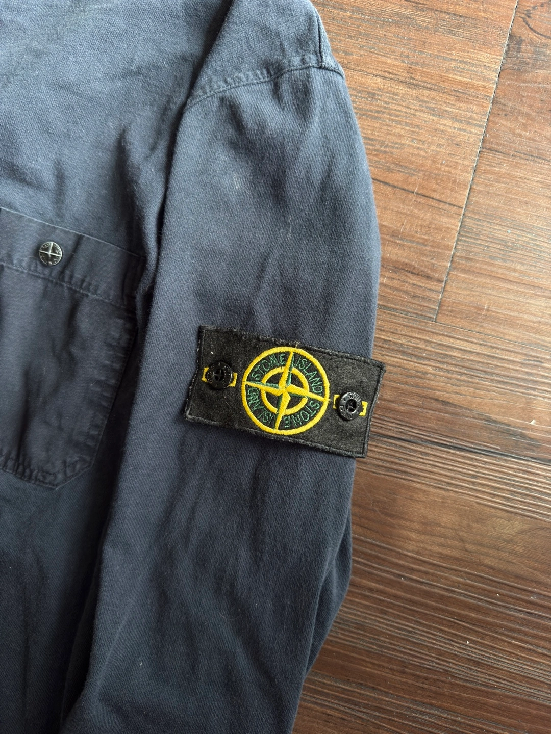 [For Sale] Vintage SS95 Stone Island Utility Long Sleeve — Size L ℹ️ A rare and early piece from Stone Island’s Spring/Summer 1995 season, this garment-dyed long sleeve showcases the brand’s utilitarian design language in its purest form. Crafted in Italy from soft 100% cotton, it features a dyed navy/darkblue colour standout oversized chest pocket secured by a metal snap embossed with the iconic Stone Island compass — a subtle nod to the brand’s technical heritage. What sets this piece apart is the presence of the original removable sleeve badge, a feature seldom seen on lightweight jersey garments from this era. This detail, combined with the Sportswear Company S.p.A. wash tag and archival ART code (551521042/518), places it firmly in the collectible Osti-era lineage — a true vintage rarity almost never seen for sale today. Finished with ribbed cuffs, a soft worn-in fade, and early-90s construction quality throughout. A grail-worthy addition for Stone Island archivists or anyone chasing obscure pieces from the brand’s golden era. 📏 Size: Tagged L — fits true to size 📐Measurements : Length:27 inches Chest:20 inches Shoulders 17 inches Sleeve Length:23 inches ✅ Condition: Very good vintage condition — clean with no holes or damage. Natural fading from age/wash. Badge and metal compass snap intact.