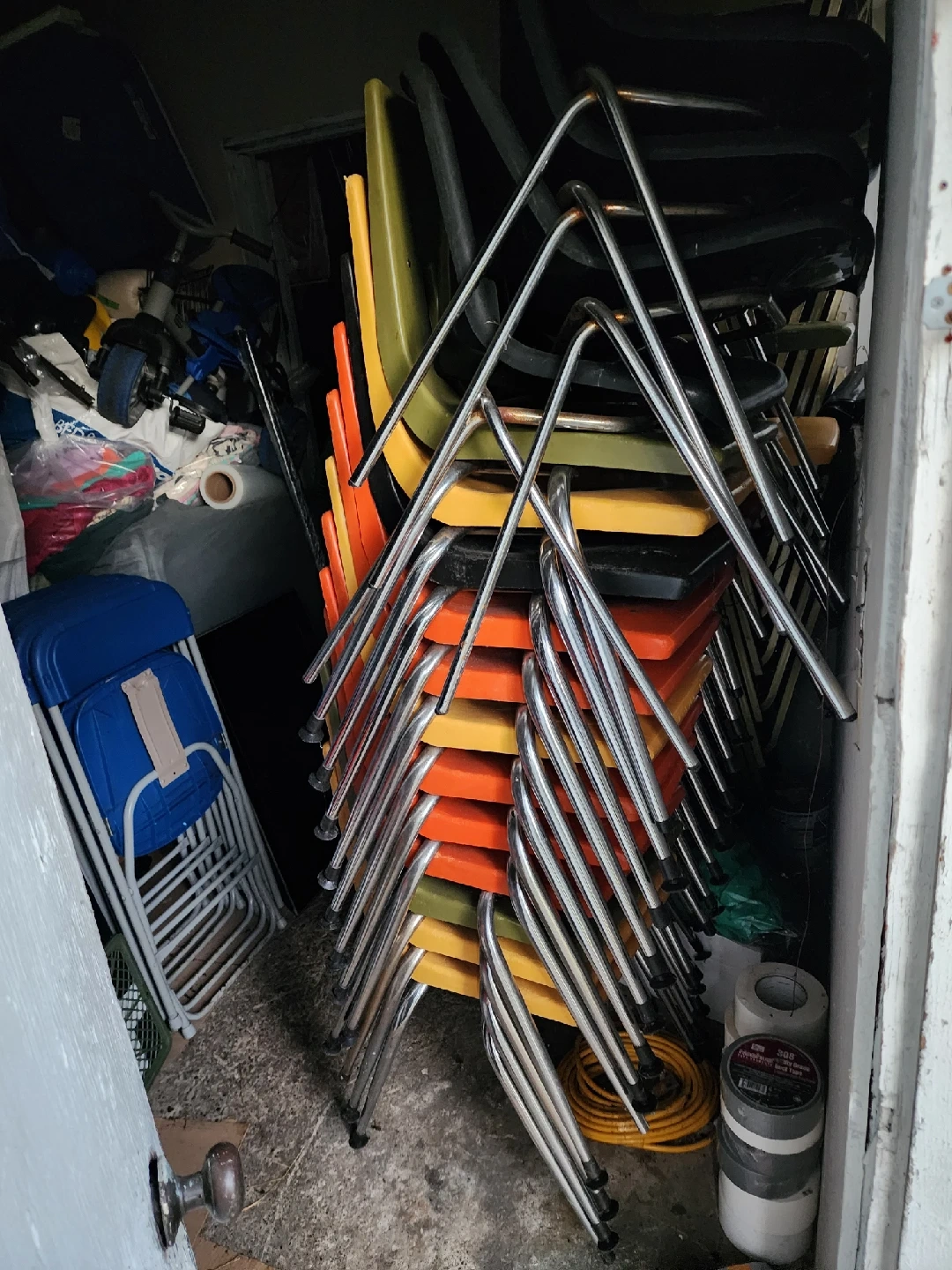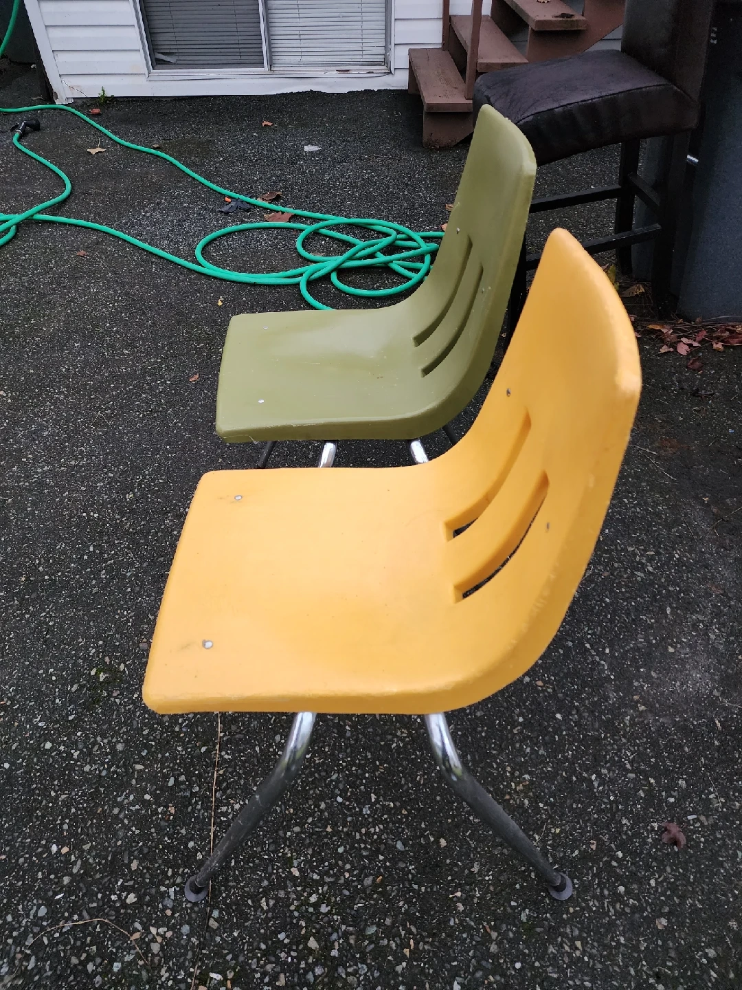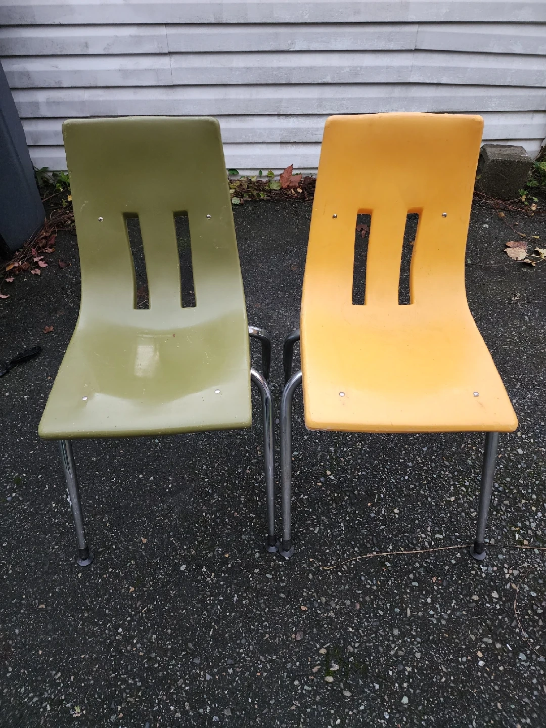 96Selling a set of 29 vintage stacking chairs! One is a nice olive green, and the other is a sunny yellow. They've got a cool retro vibe and are perfect for adding a pop of colour to your space. Sturdy metal legs make them super practical too. 29 pcs available in store. In good condition. price: $10 each. I'm open little bit to an offer for someone who will take all.