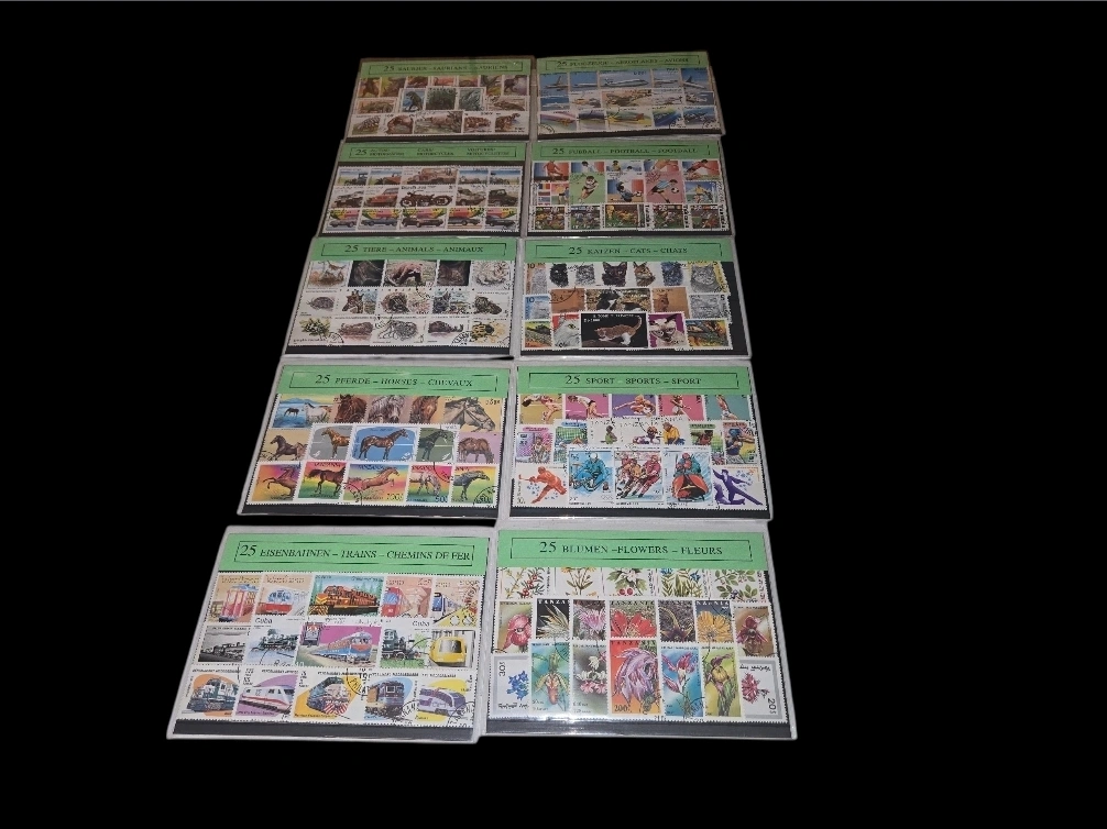 Selling a collection of vintage stamps, each set featuring 25 stamps with various themes like animals, sports, flowers, and transportation. A great find for stamp collectors or anyone interested in unique vintage items!