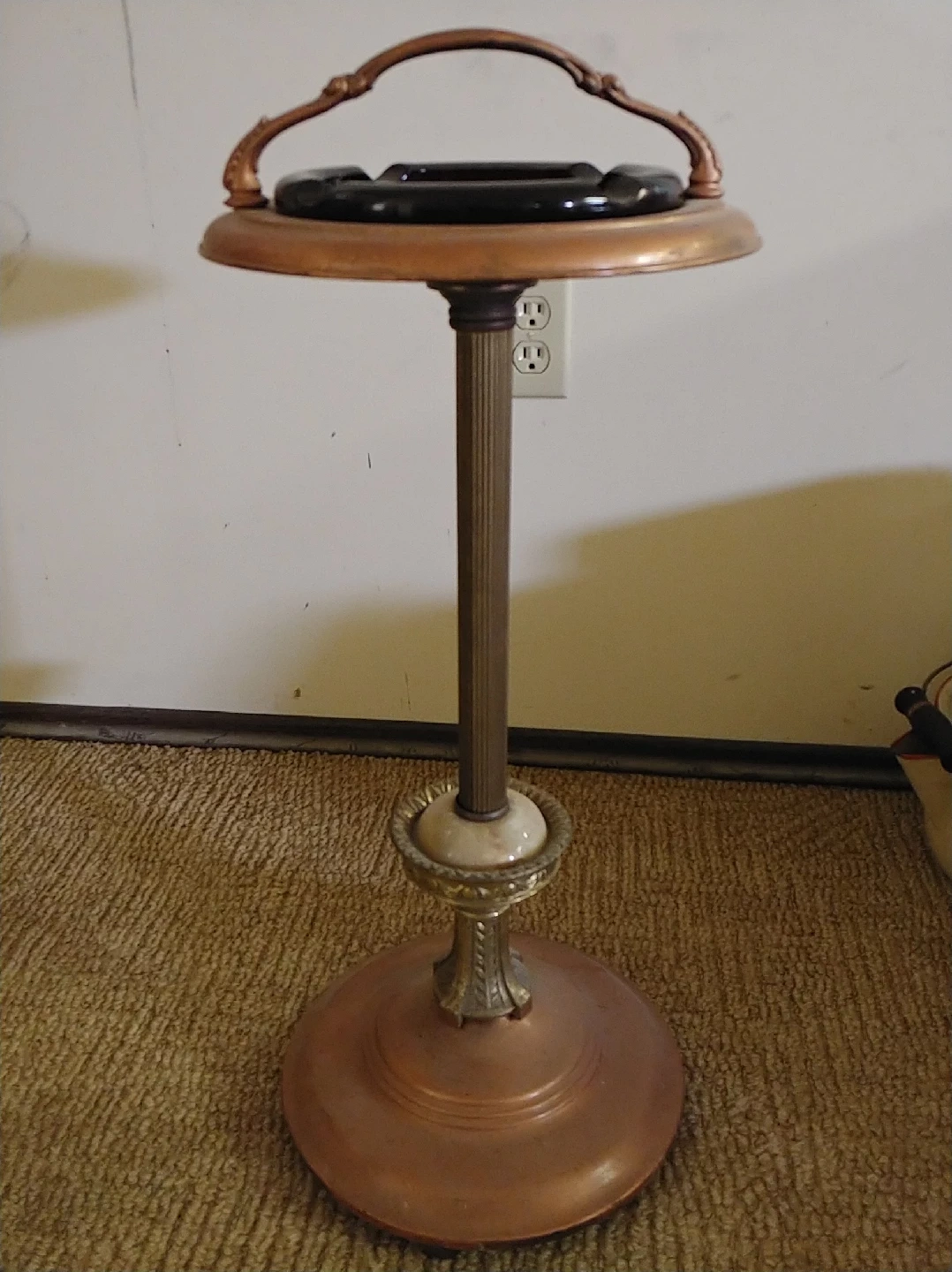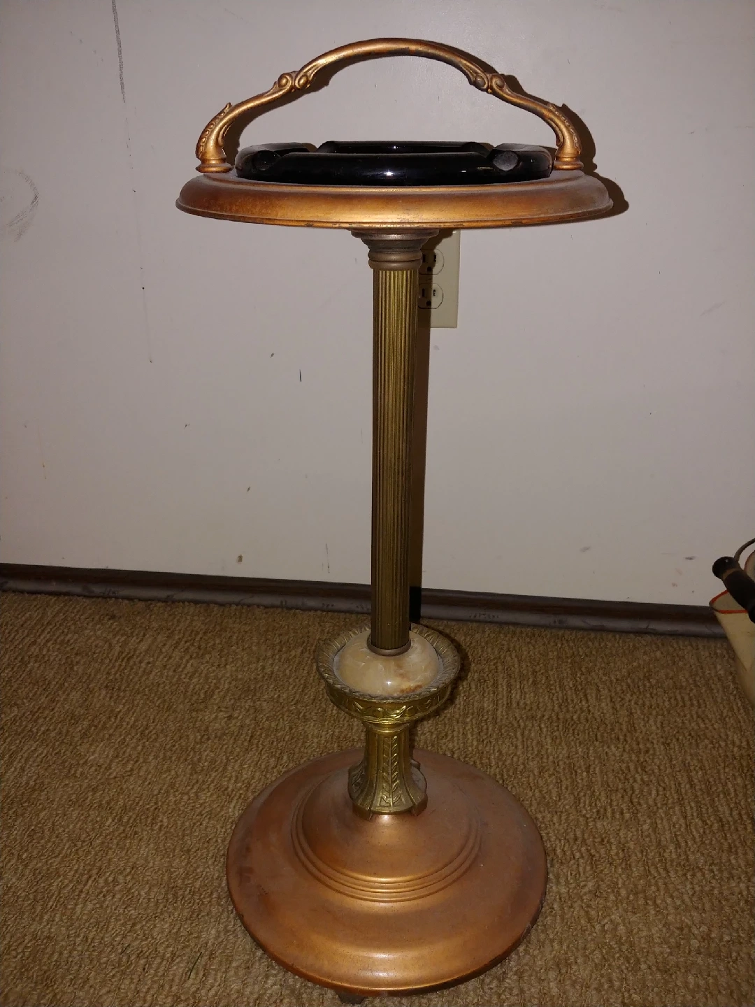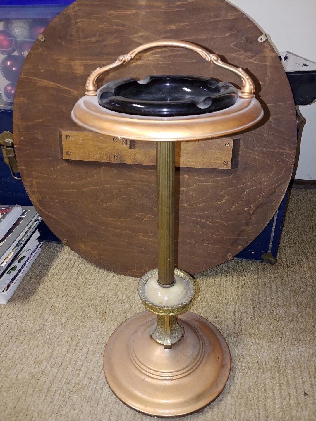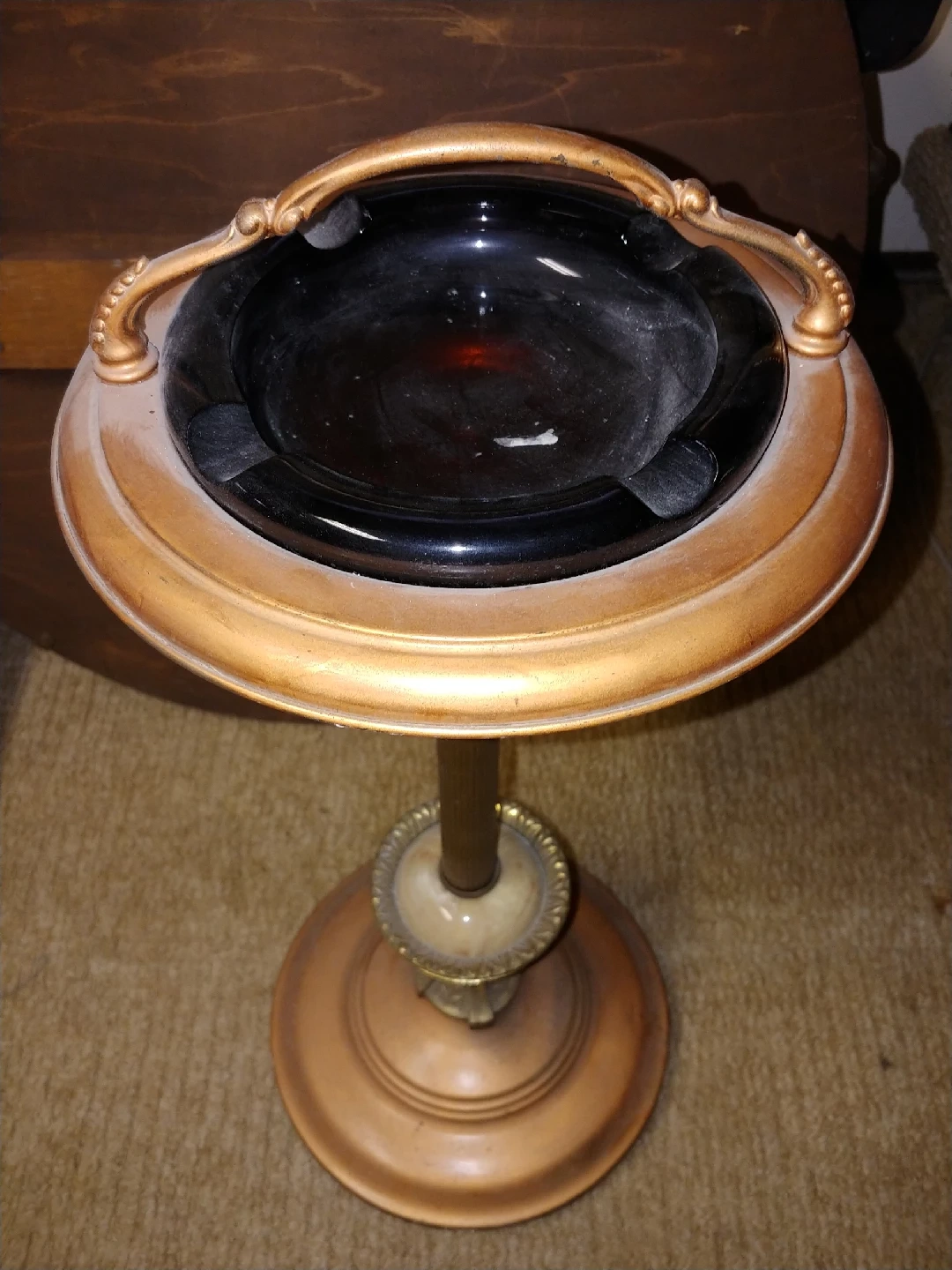17Selling a vintage standing ashtray. It has a unique design with a handle and a sturdy base. In fantastic condition. The ashtray is black glass and the rest of the stand is a copper or gold colour. It would be a great addition to any collection or a unique piece of home decor