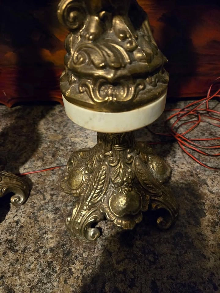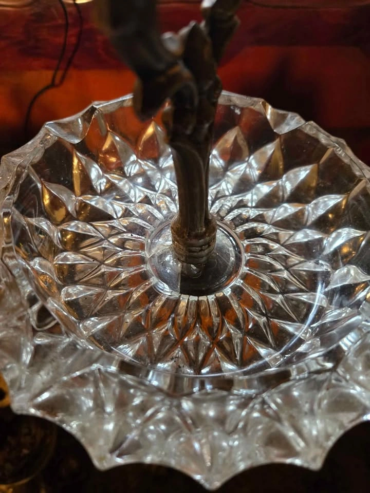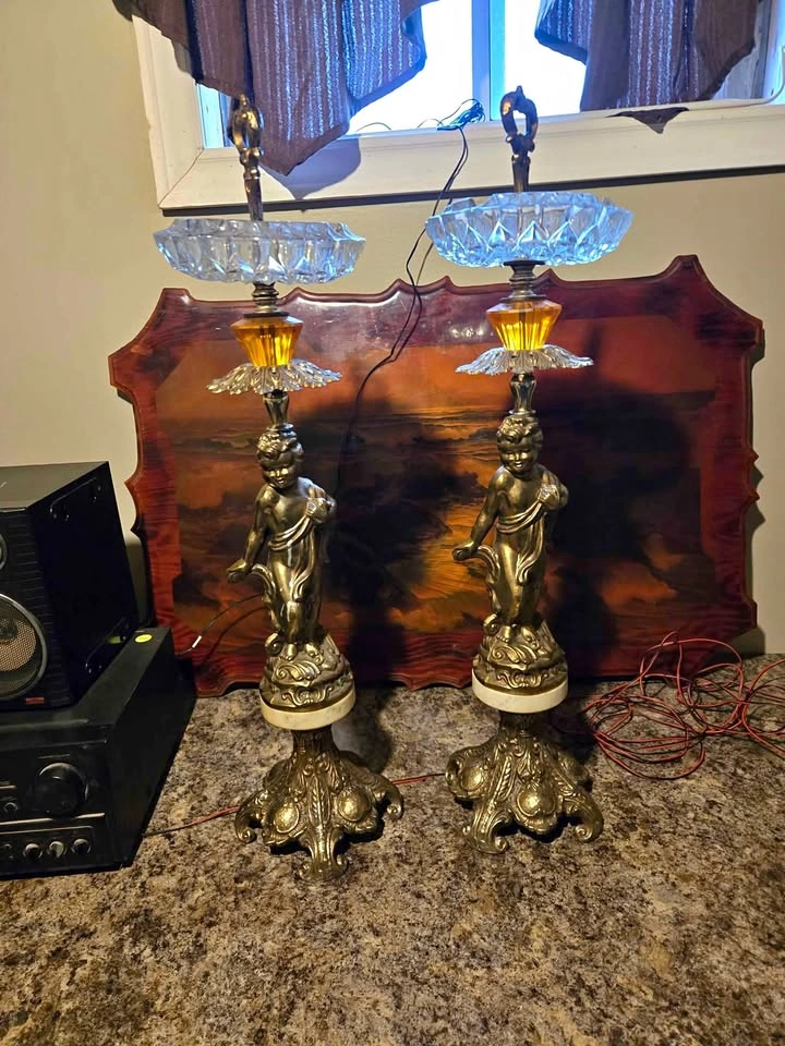 21These are a pair of vintage ashtrays featuring ornate metal cherubs, marble, and crystal dishes. These ashtrays have a unique antique charm and could be a great addition to a collection or as statement pieces in a room. They have some wear, as seen in photos, and are priced accordingly. Priced at $175.