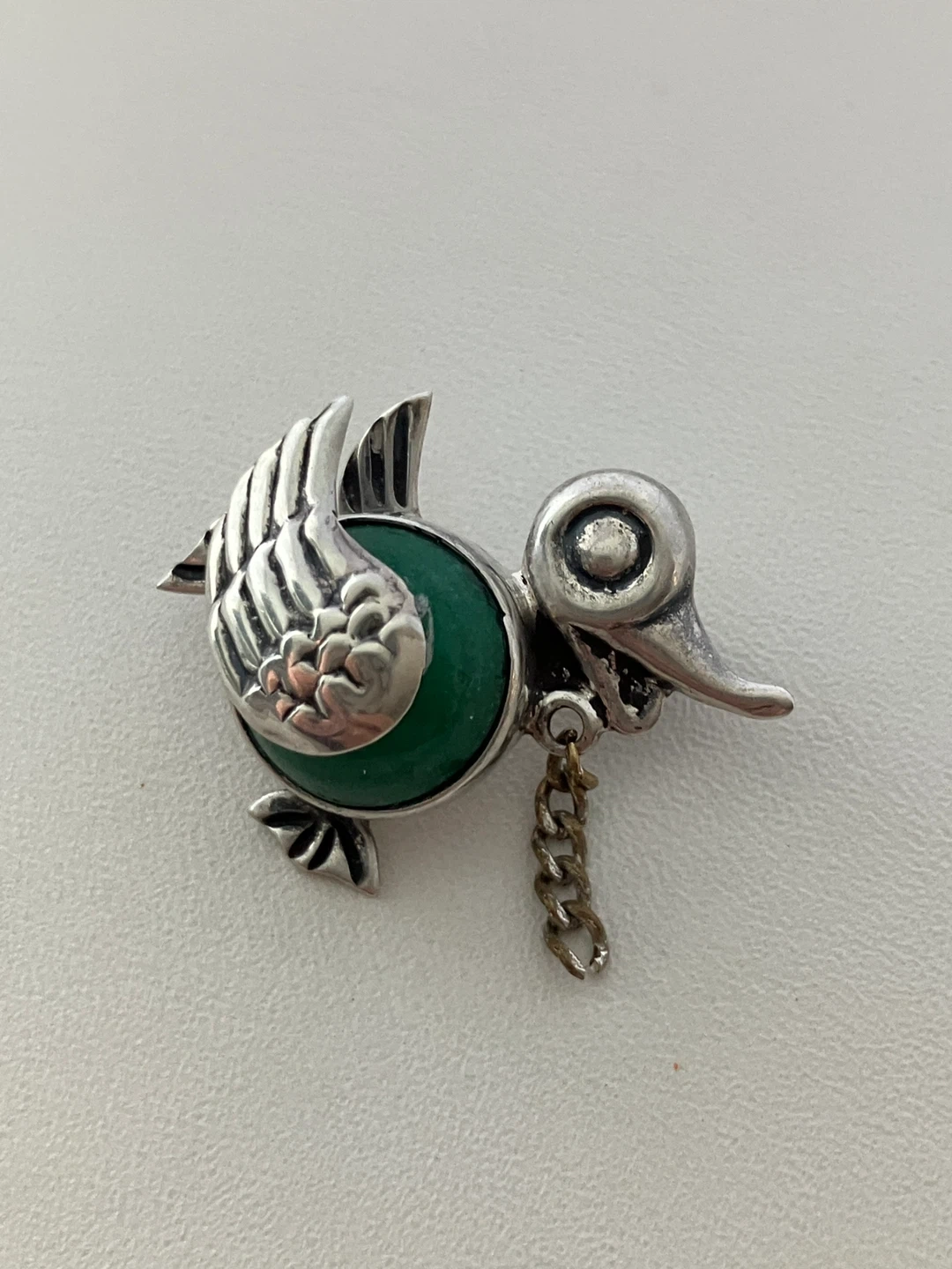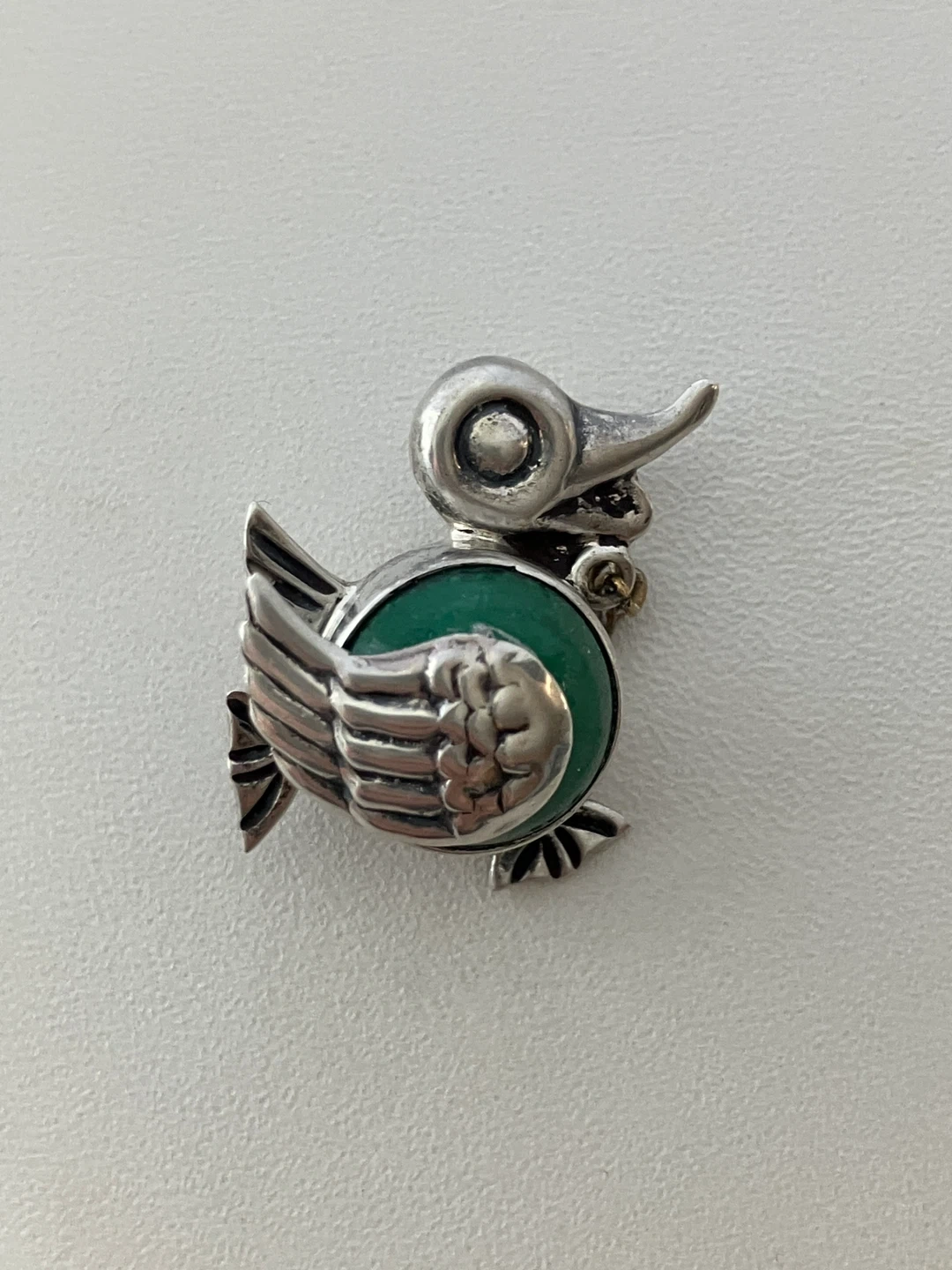18Cute duck brooch featuring a green stone. The brooch is sterling silver and is about 1 inch in size. It's in great condition and would be a lovely addition to any outfit!