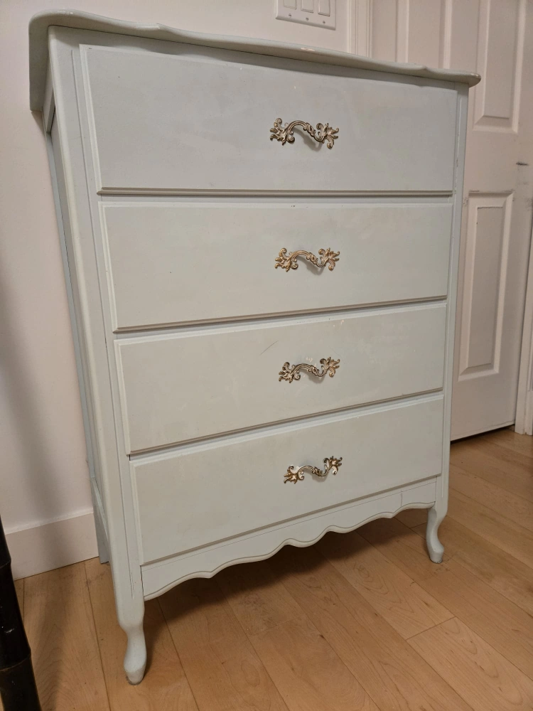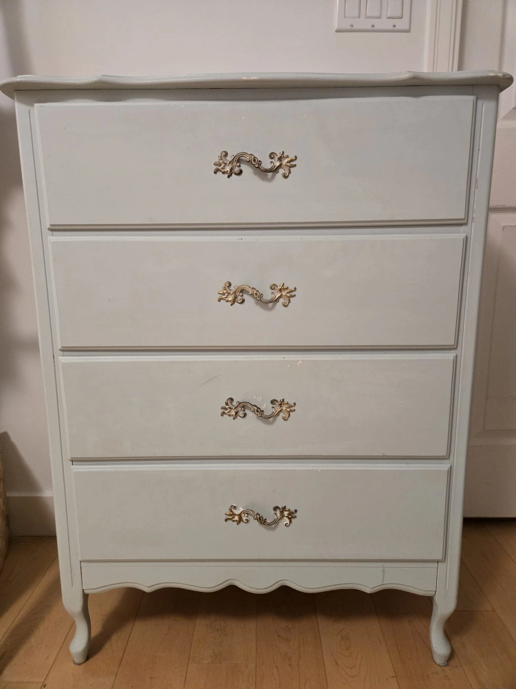 Selling a lovely vintage-style four-drawer dresser. It's in good condition and has beautiful ornate drawer pulls. Perfect for adding a touch of elegance to any room! Pick up in Langley or Vancouver