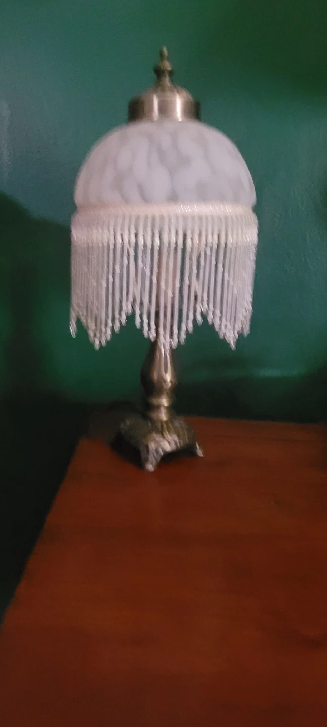 70Here's a lovely vintage-style table lamp that would add a touch of elegance to any room. It features a beaded fringe and a decorative base.