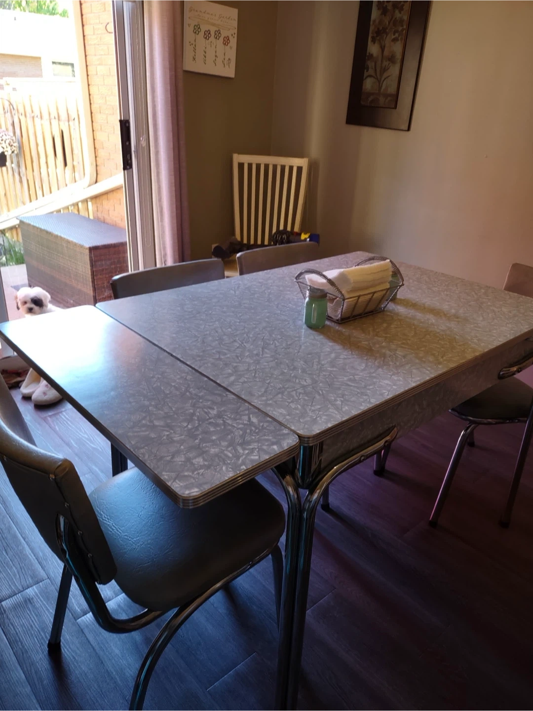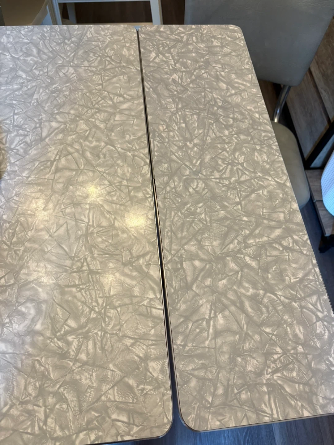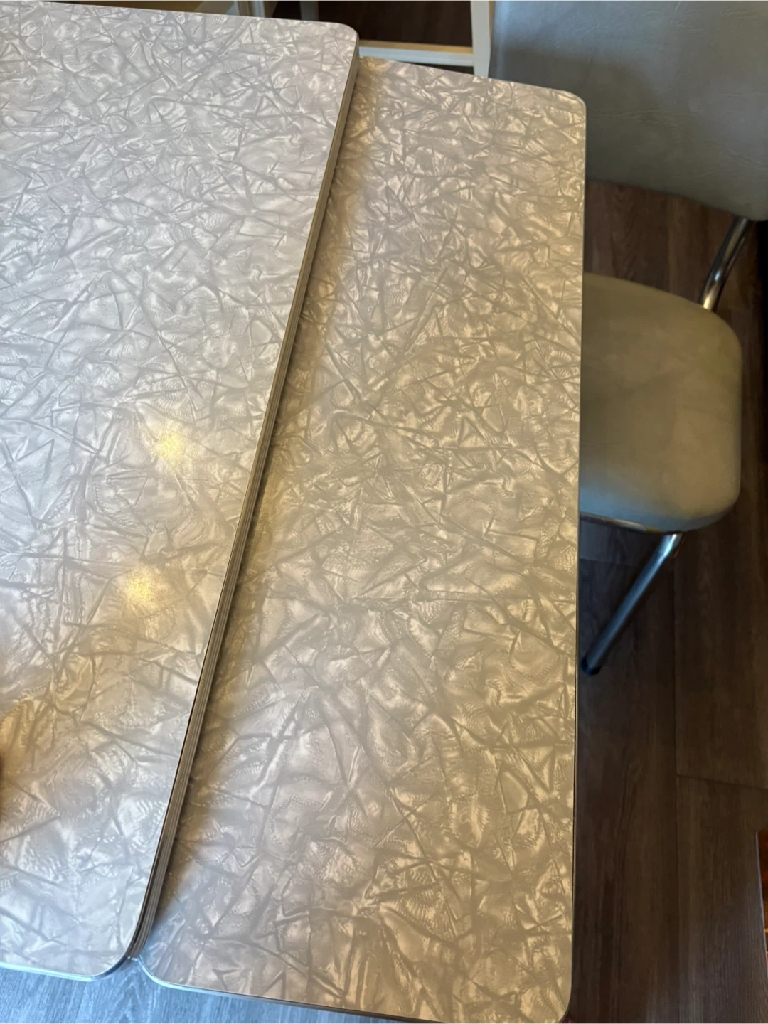 60Selling a vintage-style dining table with four matching chairs! The tabletop has a unique textured pattern, and the chairs have a classic design with chrome legs and neutral-toned seats. It's a great set to add a retro touch to your dining area