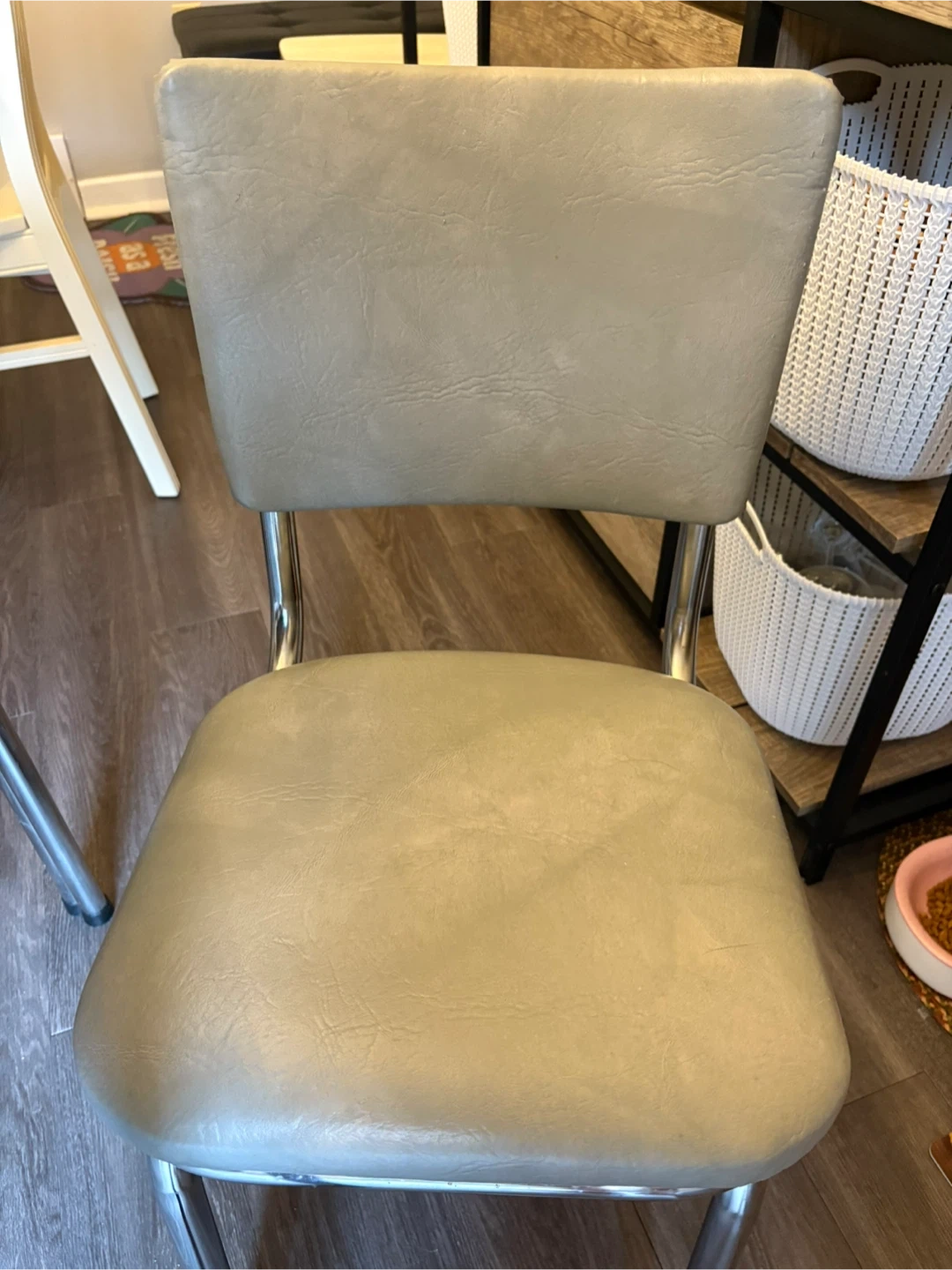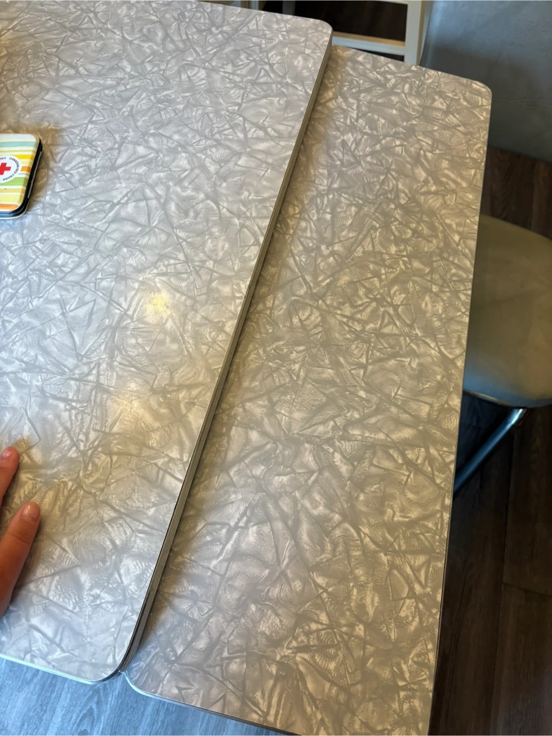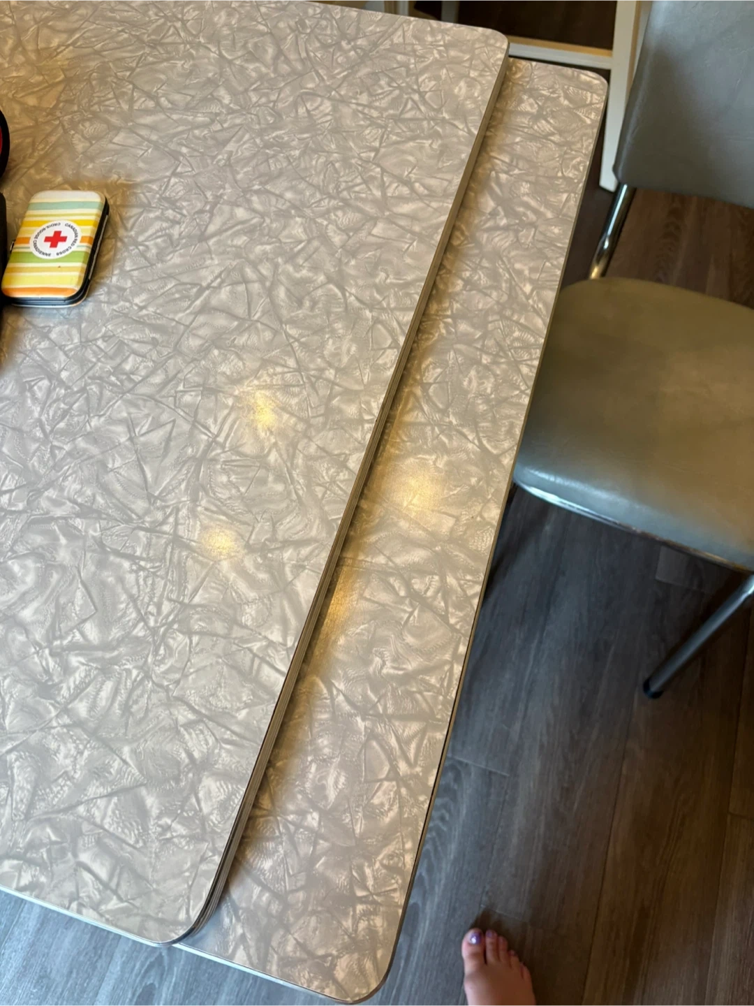60Selling a vintage-style dining table with four matching chairs! The tabletop has a unique textured pattern, and the chairs have a classic design with chrome legs and neutral-toned seats. It's a great set to add a retro touch to your dining area