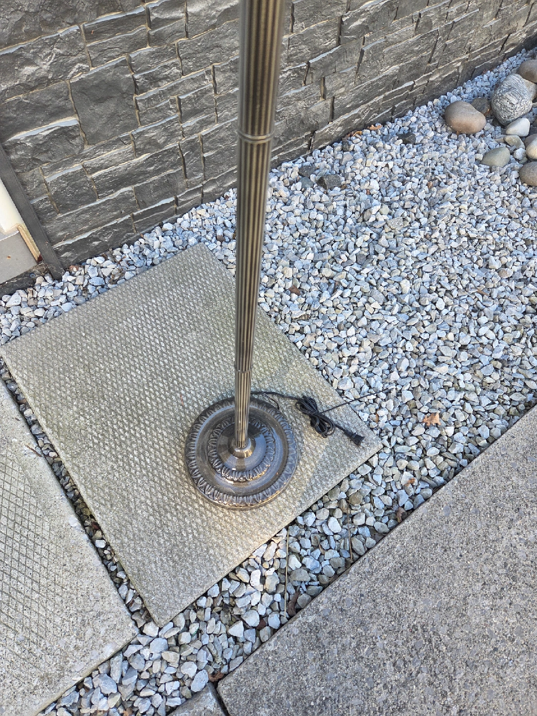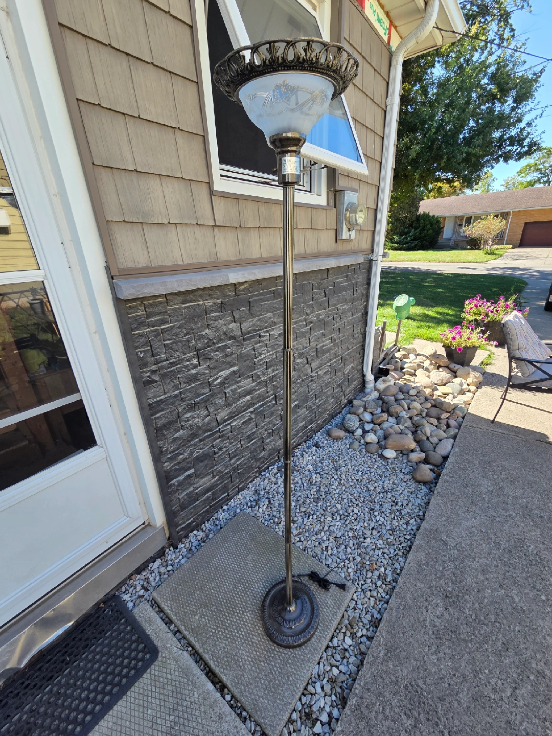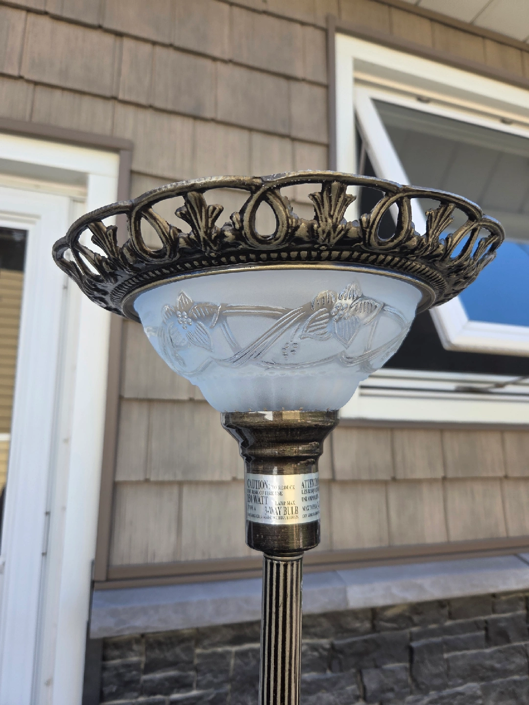 Add a touch of vintage charm to your home with this lovely floor lamp ! It features a decorative base and an elegant frosted glass shade with floral details. Perfect for creating a warm and inviting atmosphere in any room