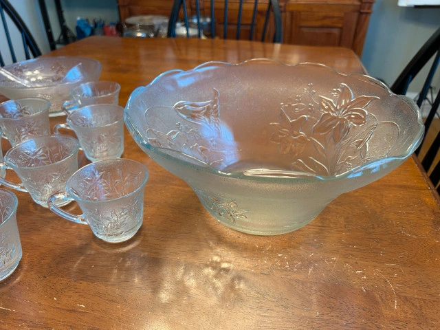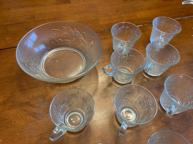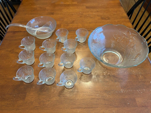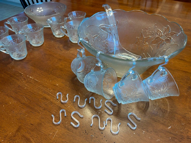 Vintage style glass punchbowl with matching 12 cups and ladle. Comes with 12 hooks to suspend the cups from the edge of the punchbowl. Condition: Used - Like new For Sale By: Owner Payment: Cashless payment, Cash accepted