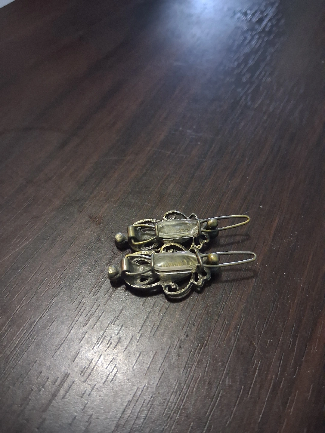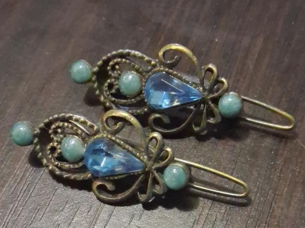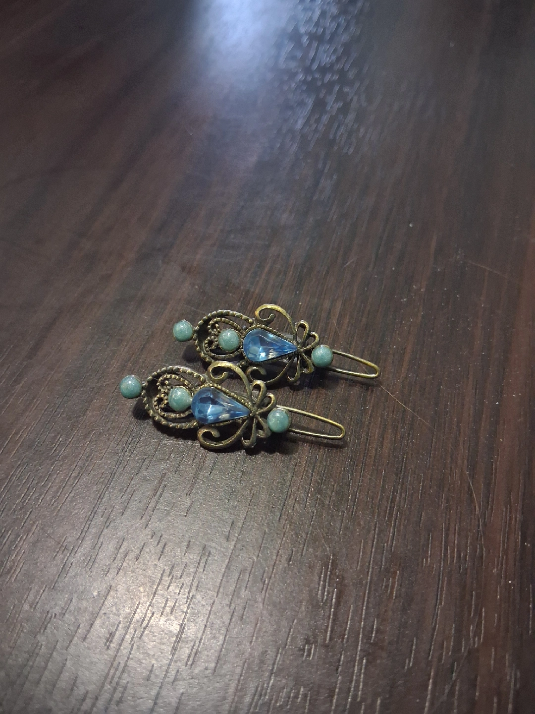 353Selling a pair of vintage-style hair clips! They have a lovely ornate design with what looks like turquoise-coloured beads and a blue teardrop gem. They're a lovely addition to any hairstyle and add a touch of vintage charm