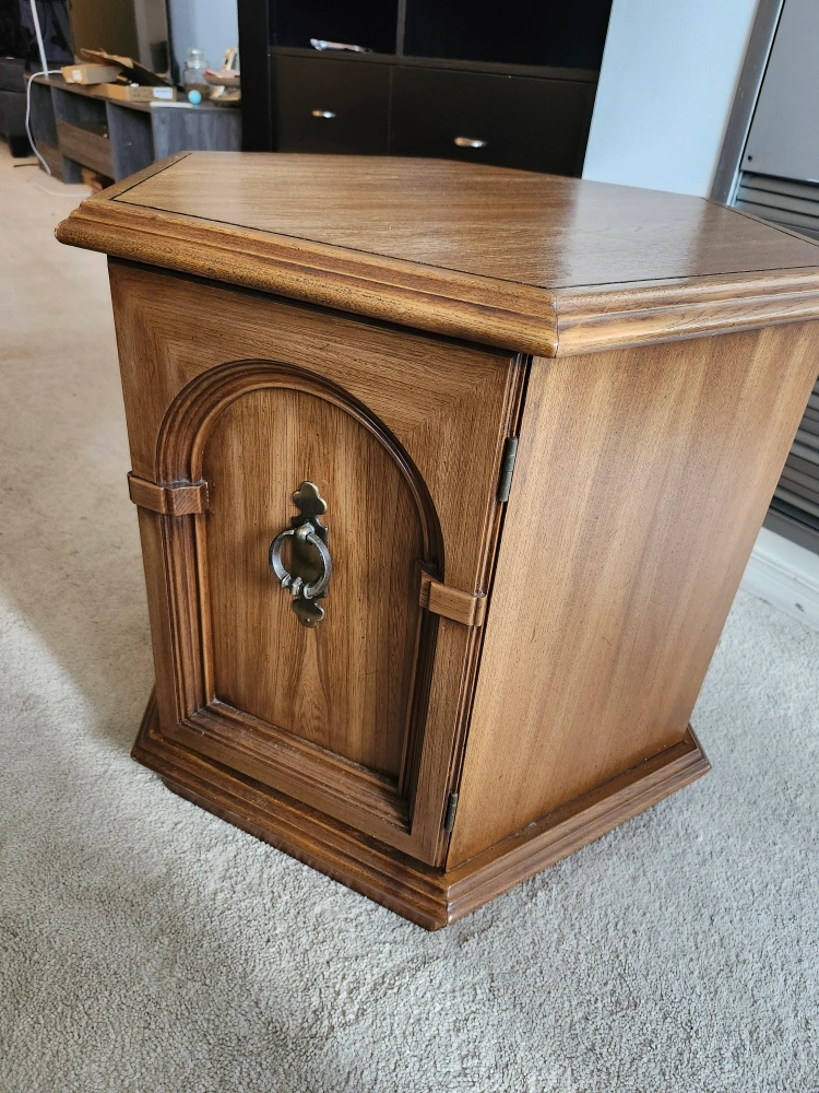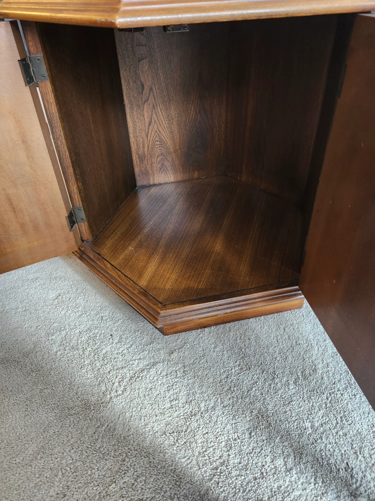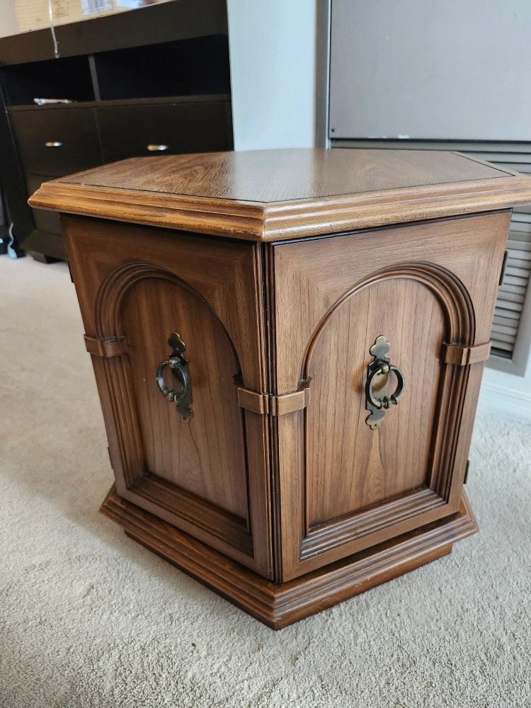 Here's a lovely wooden side table with a unique hexagonal shape! It features a rich, warm wood tone and antique-style hardware. It's like new. Then it would be a great addition to any living room or bedroom. W 55" L 65" H 55" Near Yonge and Sheppard