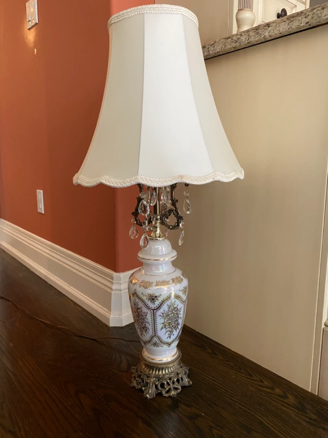 Selling a beautiful vintage-style table lamp. It features a white shade and an ornate base with gold accents and crystal-like details. It would be a lovely addition to any room!